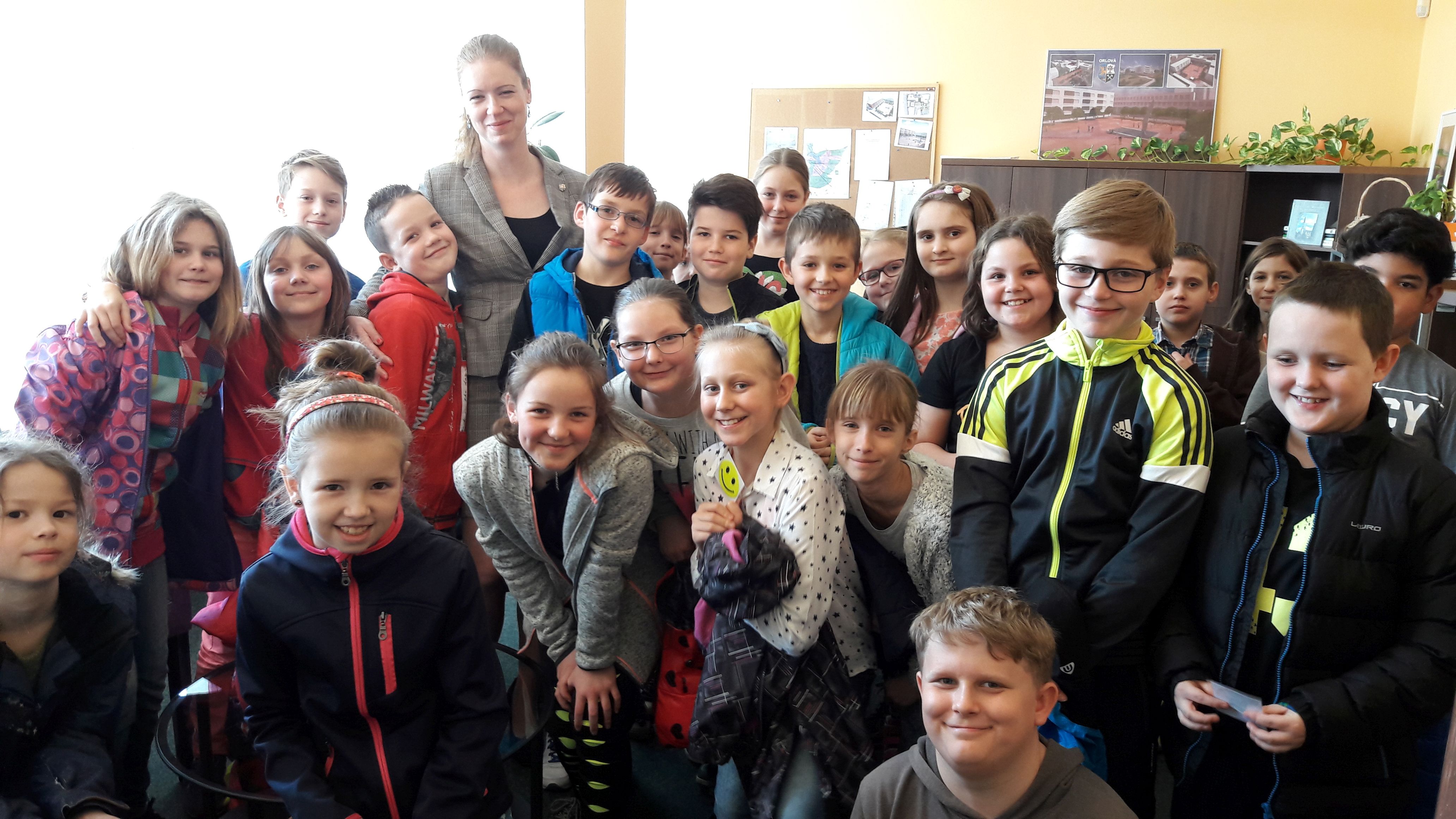 3.4.2017V úterý 28. března 2017 navštívila naše třída Městský úřad v Orlové. Hned u vchodu nás s úsměvem na rtech přivítala Bc. E. Floriánová, která s dětmi zopakovala základní informace (co jsou to úřední hodiny a kdy jsou, kde všude jsou budovy úřadu, kdo stojí v čele města, …). Poté jsme se přemístili do kanceláře matriky, kde nás paní I. Lindertová a A. Salamonová seznámily s matričními knihami, se speciálním inkoustem, kterým se do těchto knih píše, i s dalšími zajímavostmi, které děti pečlivě pozorovaly. Po návštěvě matriky nás čekalo osobní setkání s paní místostarostkou Ing. P. Jenčmionkovou, která nás mile přivítala, s dětmi si povídala,