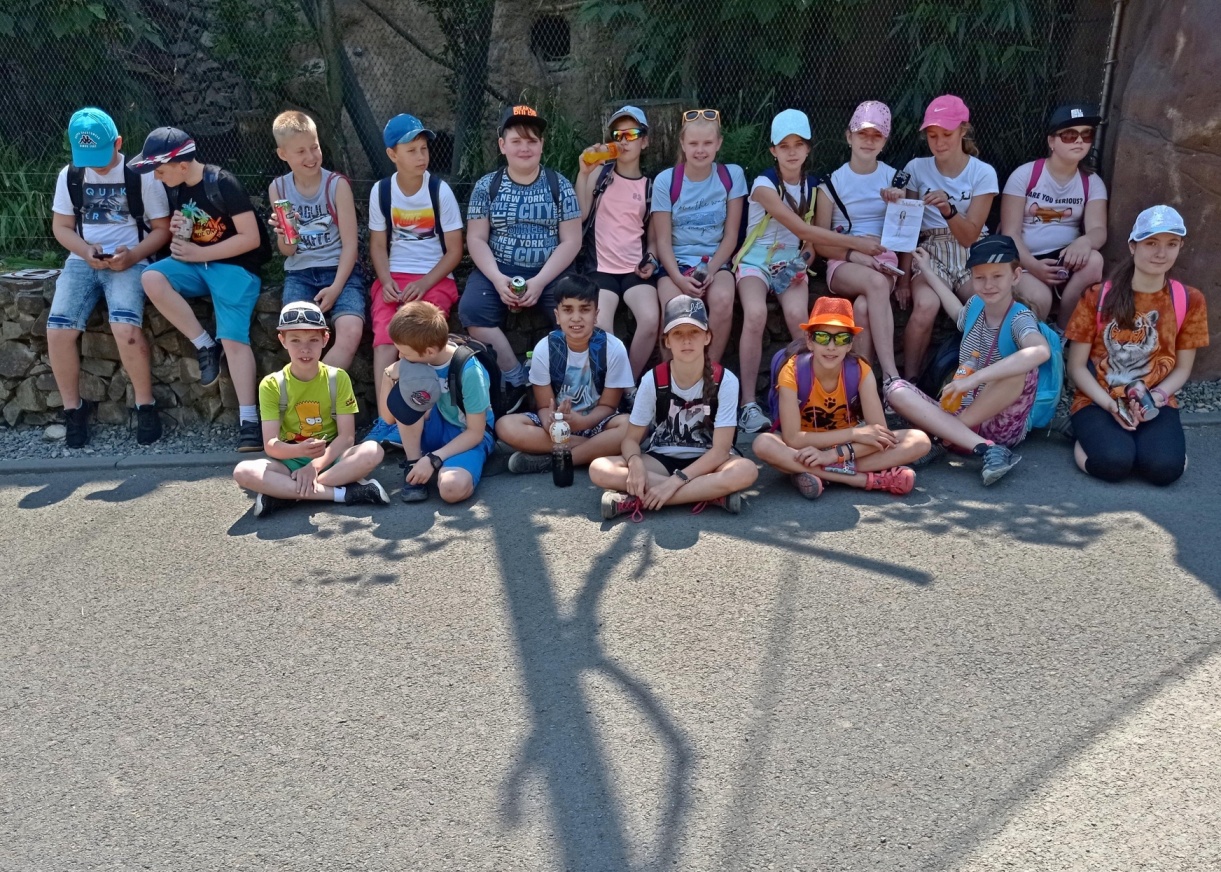 Výletní den začal krásným slunečným počasím. Již dlouho předem jsme byli natěšeni na to, čím nás zvířátka překvapí. První zastávka byla u krásných plameňáků, kteří nám předvedli, jak při odpočinku dokážou stát na jedné noze s hlavou ukrytou pod křídlem. Poté jsme pokračovali dál a těšili se, až se dostaneme ke kozám, mezi které je možno volně vstoupit a nakrmit je zakoupenými granulkami. Velké pozdvižení způsobilo, když se kozy snažily zjistit, co to máme za dobrůtky v dlaních, běhaly za námi a některé na nás i vyskakovaly. Po krmené „divé“ zvěře jsme pokračovali v prohlídce. Cestou jsme měli možnost pozorovat levharta, spícího lva, opice s jejich akrobatickými kousky, krásné zebry, obrovského slona indického a další. Unaveni vedrem a dováděním na různých atrakcích jsme uvítali možnost svézt se na zpáteční cestě zoovláčkem, který nás bezpečně dovezl až na samý začátek našeho putování za zvířátky. Kromě prohlídky jsme měli příležitost utratit i nějakou tu korunu, ochutnat ledovou tříšť, cukrovou vatu a další pochutiny. Těsně před odjezdem jsme ještě stihli nakoupit v zooshopu drobné suvenýry pro sebe i naše nejbližší.