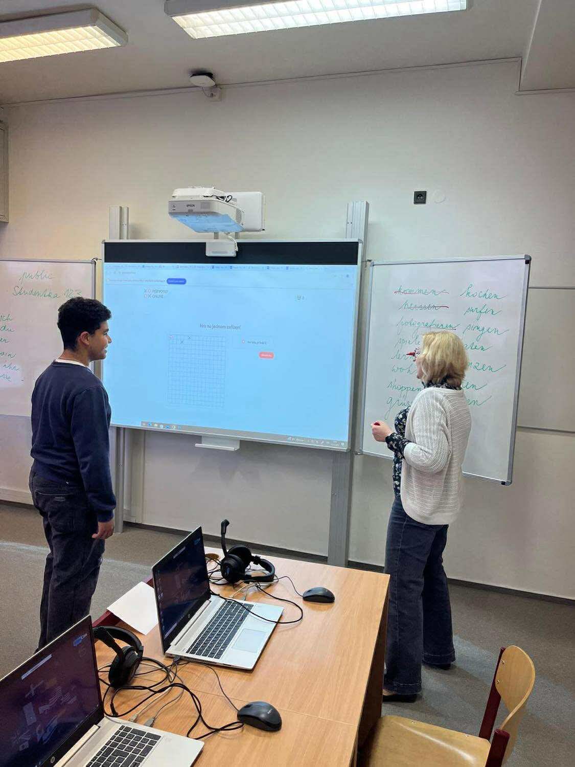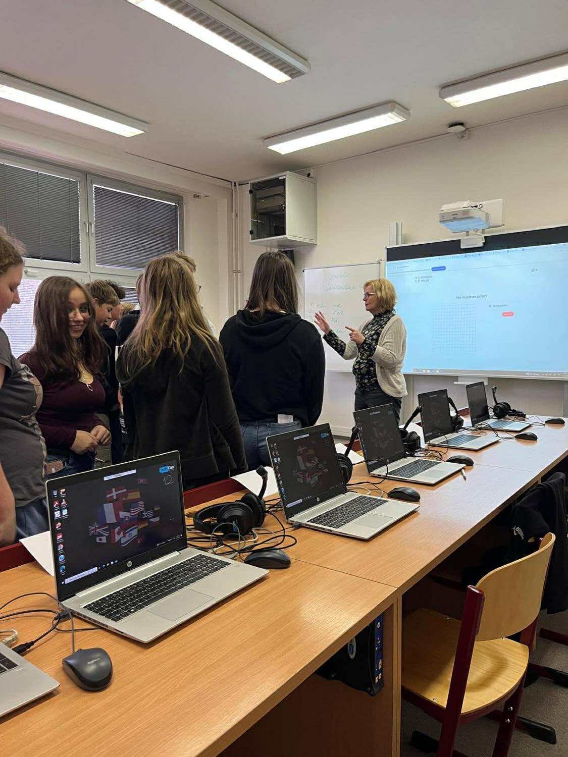 14.11.2025Žáci 8.B ze ZŠ Ke Studánce absolvovali netradiční hodinu německého jazyka na GOA Orlová. Výuka probíhala v rámci moderního vzdělávacího projektu ROBOTEL. Tento projekt propojuje jazykové vzdělávání s digitálními technologiemi. Žáci si vyzkoušeli konverzaci přes PC i interaktivní cvičení. Během výuky používali němčinu v praktických situacích. Učili se spolupracovat ve dvojicích i v týmech. Kromě toho pracovali s aplikací Blooket, která jim umožnila procvičit si slovní zásobu zábavnou formou. Soutěžní prvky zvýšily jejich motivaci a žáci pracovali s nadšením. Vyučující paní Mgr. Szeligová ocenila jejich snahu, znalosti a pěkné výkony. Celá návštěva byla příkladem moderní a efektivní výuky cizího jazyka.