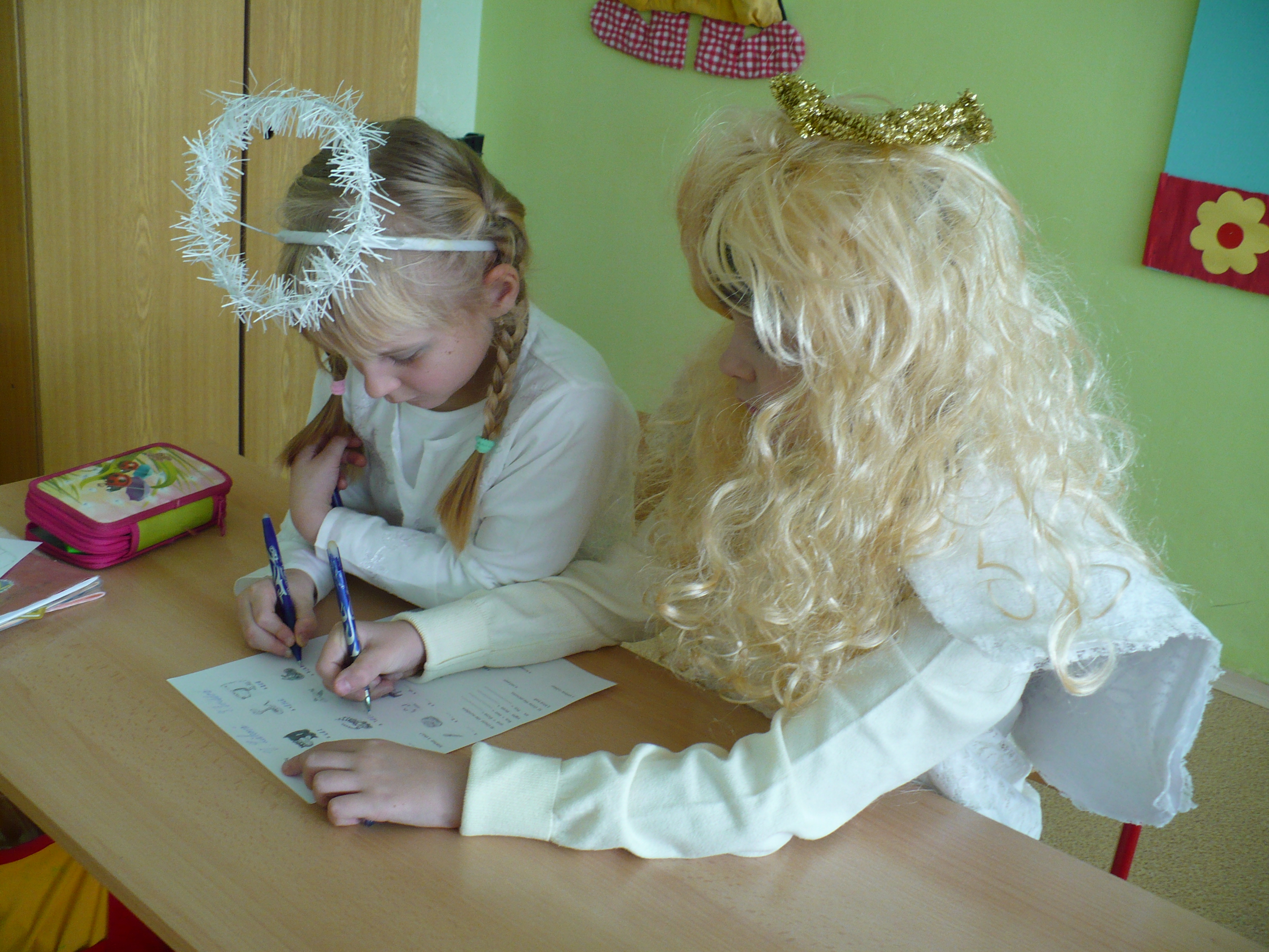 Na úvod je přivítala úřednice z ,,ministerstva andělského“ paní Andělínová / třídní učitelka/ a sdělila jim, že budou plnit různé úkoly, aby mohli dostat andělské a čertí vysvědčení. Děti pracovaly ve dvojicích a byly velmi pilné a moc se snažily. Za splněné úkoly získávaly hvězdičky /razítka/ a také sladké odměny.