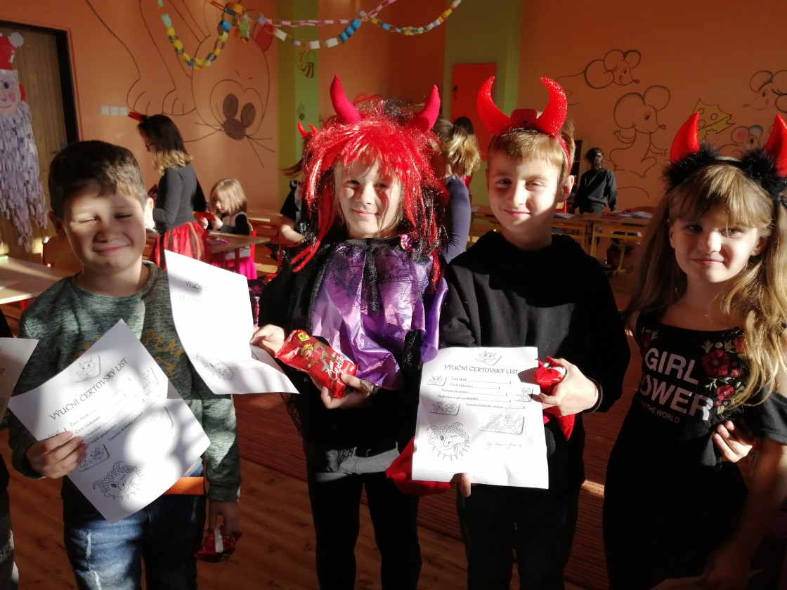 7.12.2019Ve čtvrtek 5. 12. všichni žáci 2. B přišli do školy, aby prožili dopoledne v „Čertí škole.“ Výuka probíhala podle rozvrhu a zároveň byla doplněna o pekelné úkoly. Výuční čertovský list získali všichni žáci, dokonce s vyznamenáním a navíc za svou práci dostali sladké odměny.