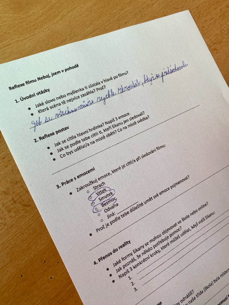 Po skončení filmu následovala reflexe vedená školní metodičkou prevence, která žákům umožnila lépe porozumět poselství filmu, sdílet vlastní postřehy a otevřeně mluvit o tom, co je osobně zaujalo nebo zasáhlo. Diskuse se dotkla témat, jako je tlak vrstevníků, vyrovnání se s kritikou, ale i hledání podpory v náročných situacích.