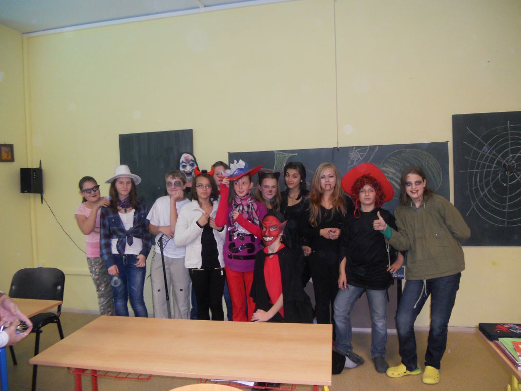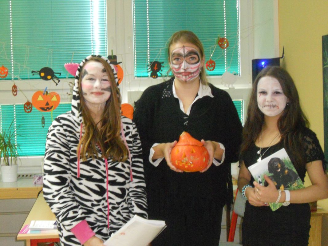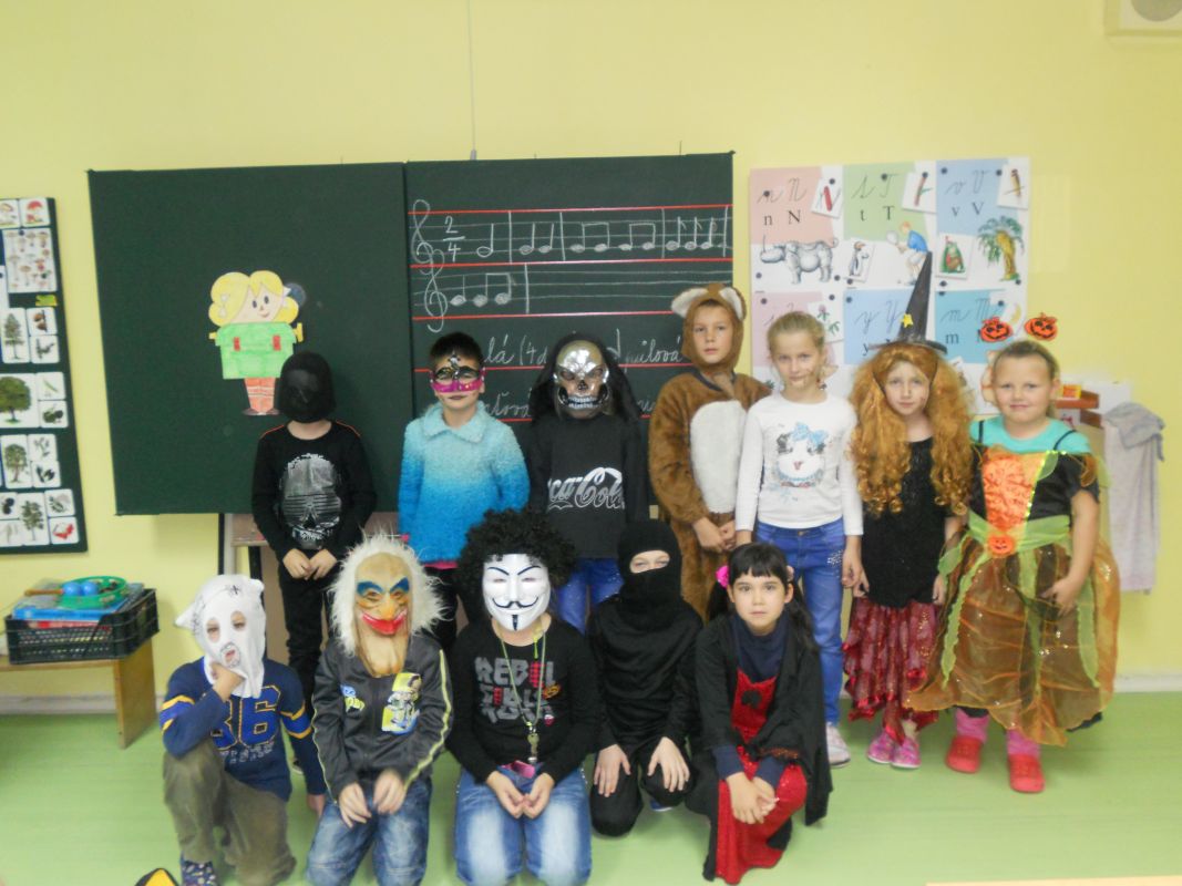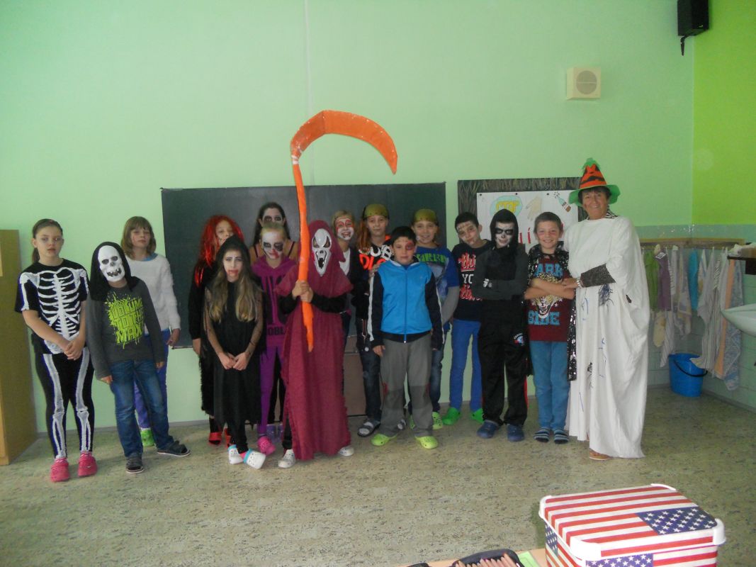 1.11.2014Konec týdne byl doslova strašidelný, ale i zábavný. Žákovská rada pod vedením paní učitelky Dagmar Murové uspořádala pro naše žáky Halloween. Všichni dobrovolníci z celé školy dorazili do školy zcela v netradičních kostýmech a maskách, od milých čarodějnic až po oživlé mrtvoly. Každý převlečený žák tak získal body pro třídu v celoroční soutěži. Dále se hodnotily nejlepší převleky, strašidelné básničky a nástěnky. Během vyučování zástupci žákovské rady seznámili všechny s tímto anglosaským svátkem, který se potajmu vkrádá do našich končin.