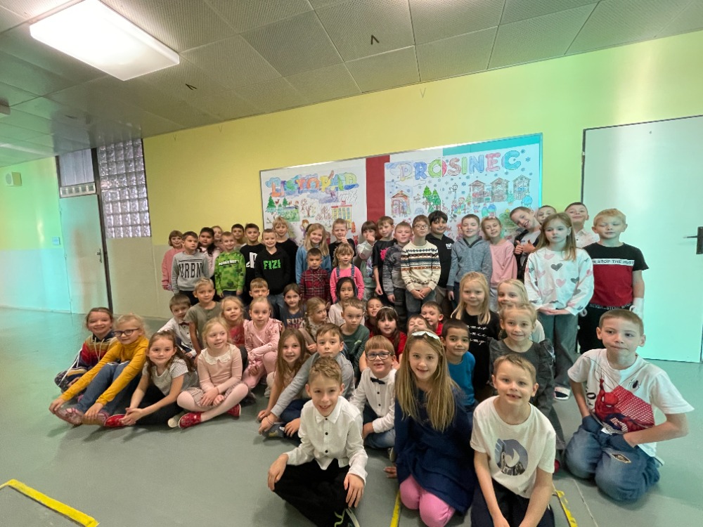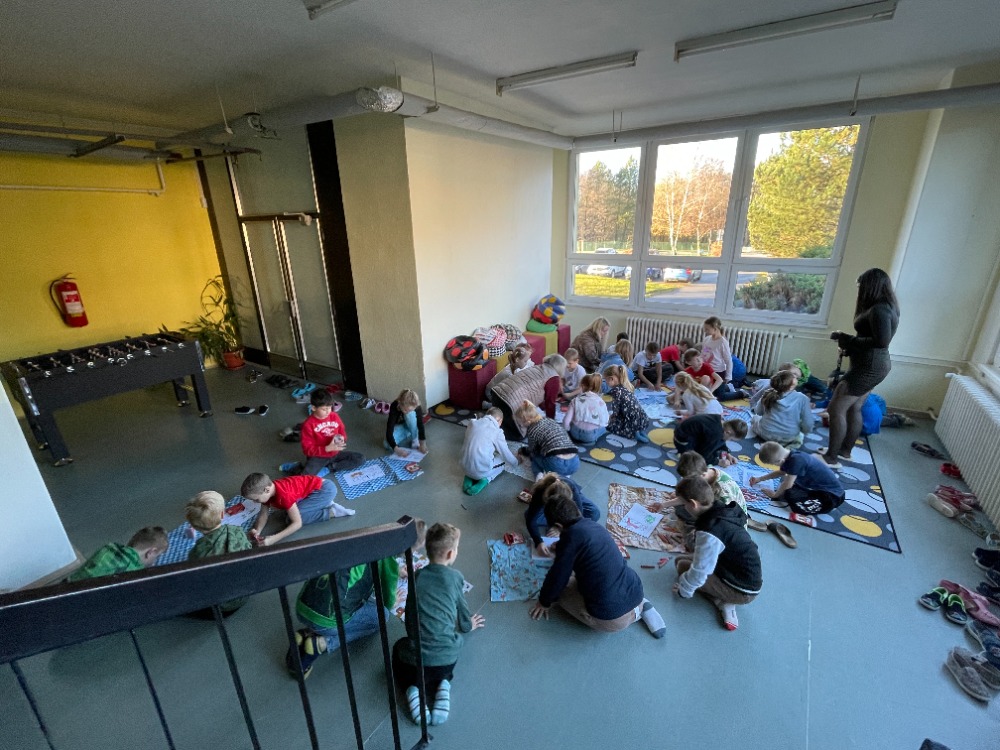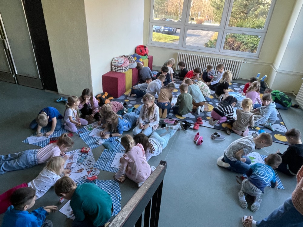 21.11.2025Ve středu 18. listopadu se přízemí naší školy proměnilo v jedno velké tvůrčí studio. Třídy 1.A, 1.B a 2.A spojily své síly a pustily se do společného úkolu – vytvořit kooperativní obrázek. Děti pracovaly ve smíšených skupinkách; nešlo však pouze o malování, hlavním cílem byla spolupráce, domluva a vzájemná podpora.