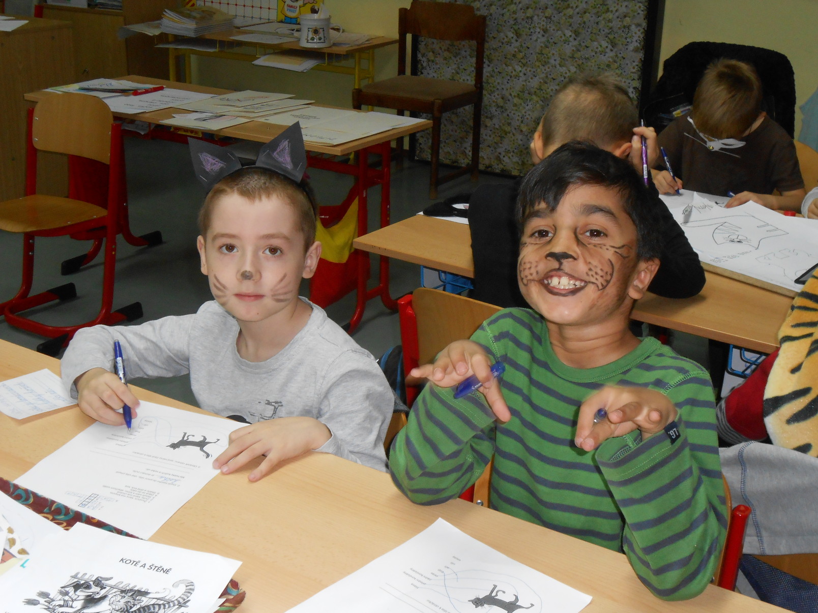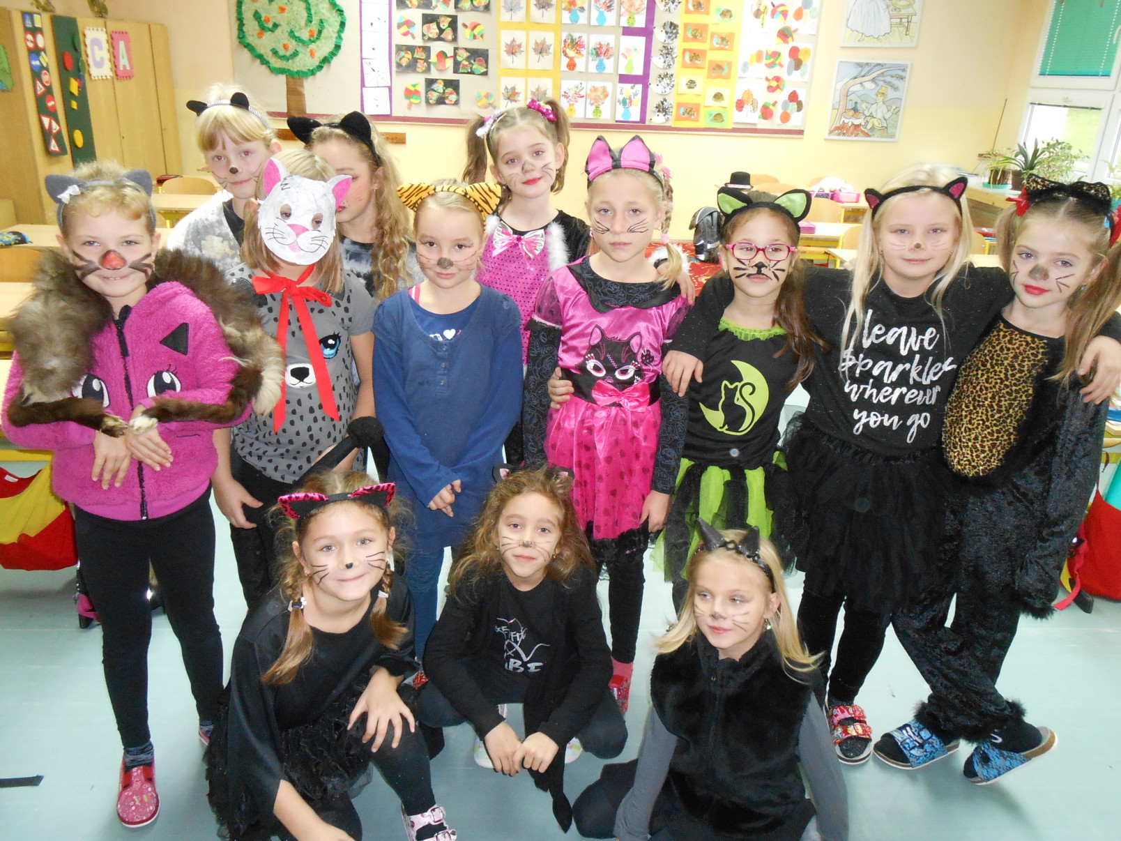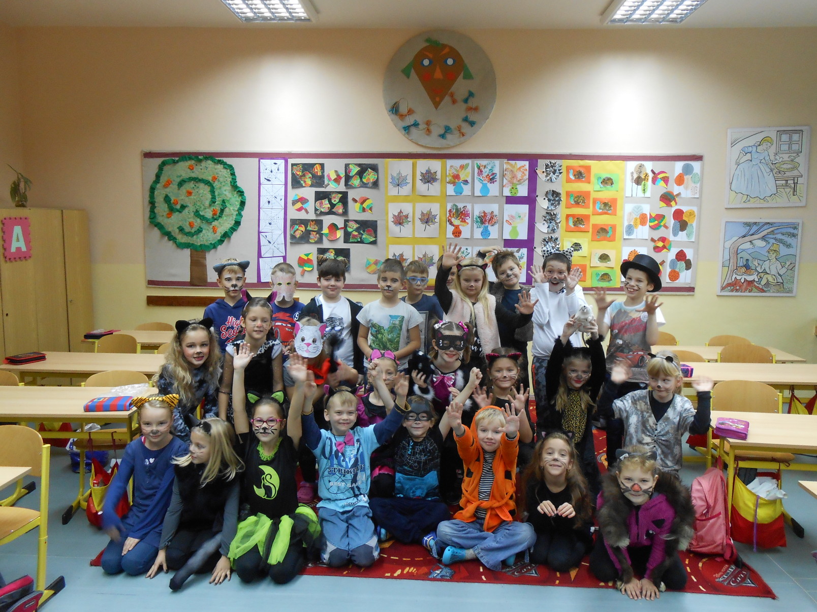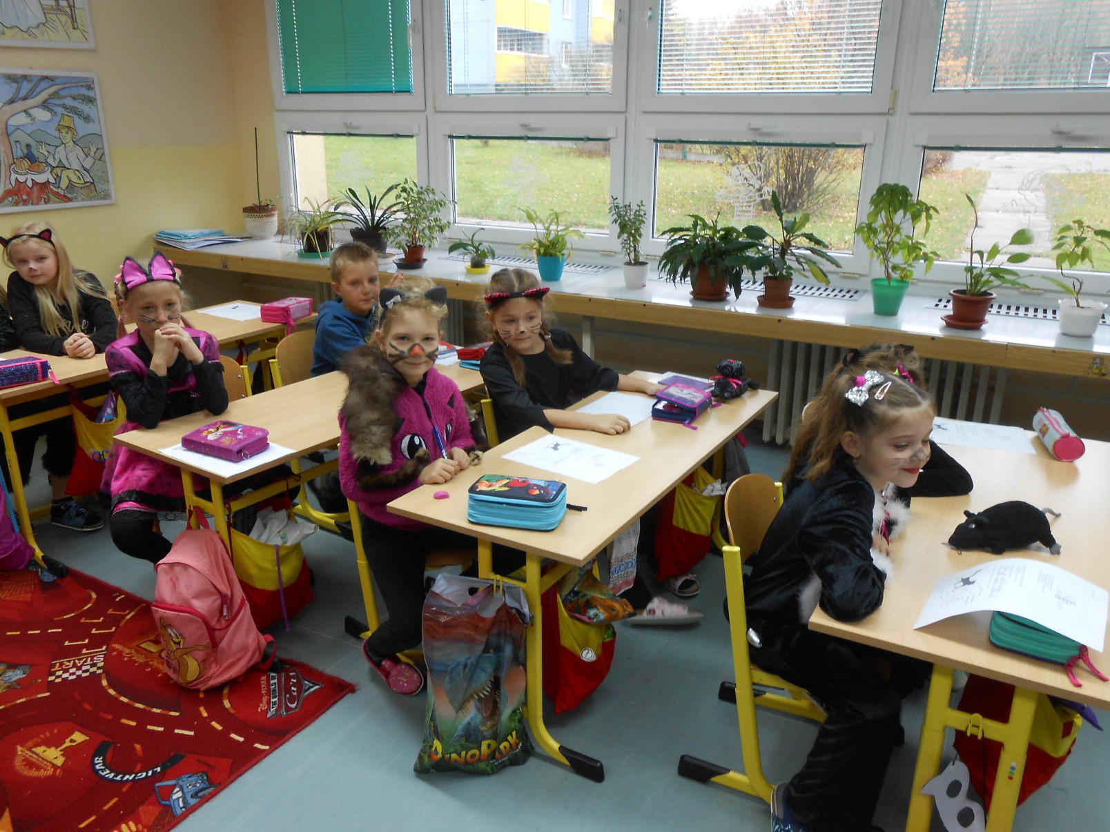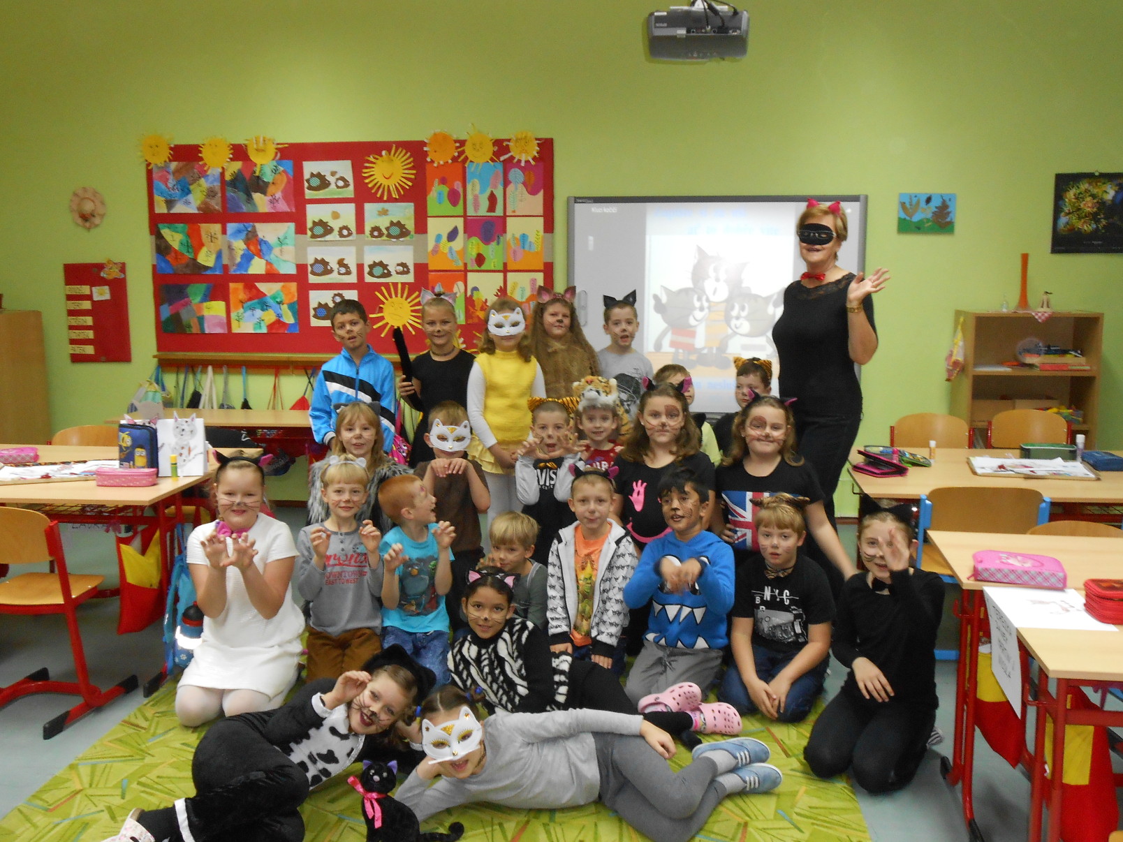 8.11.2017Že jsou kočky nudné? Ale kdepak! O tom se mohly přesvědčit děti ze druhých tříd. V úterý, 7. 11. přišli všichni ve slušivých a nápaditých kostýmech domácích mazlíčků. Navzájem se představili a kočičí hrátky mohly začít. Děti se nejdříve podívaly na pohádku Byla jednou jedna koťata a s hlavními hrdiny si zazpívaly písničku. Potom si na koberci hrály s barevnými klubíčky, skládaly věty, hádali hádanky a počítaly matematické příklady.