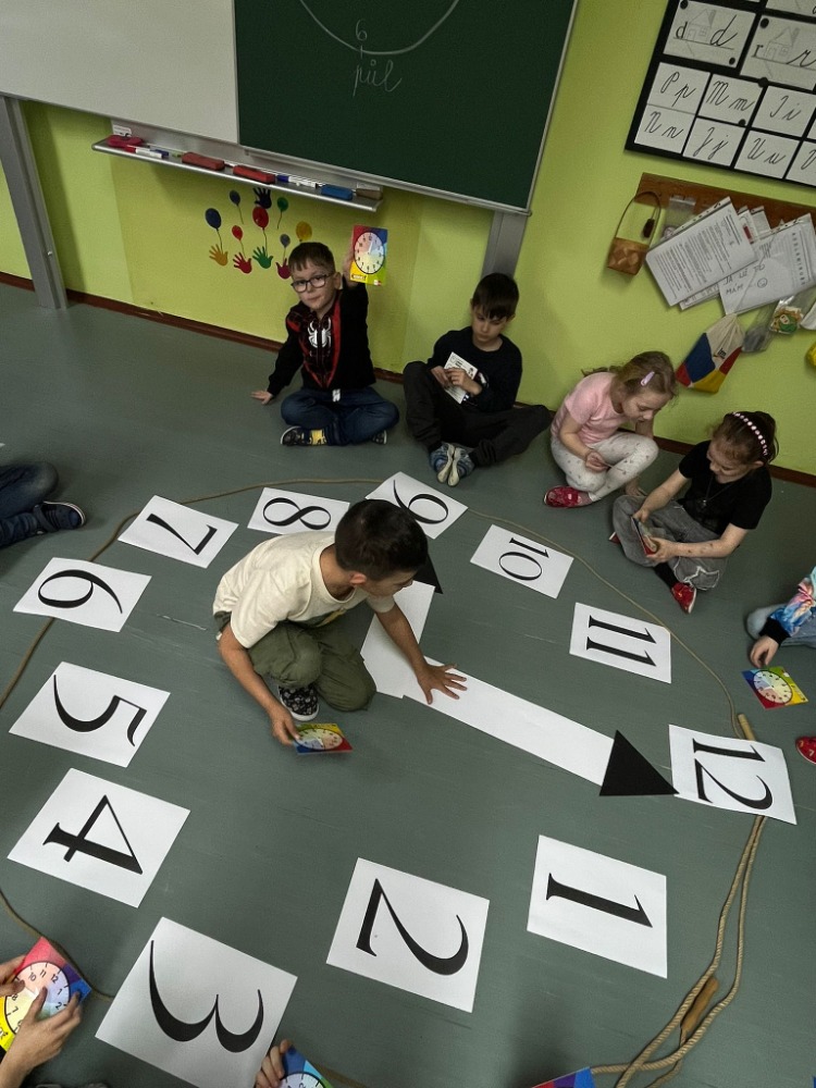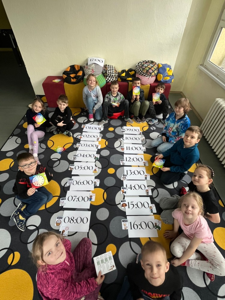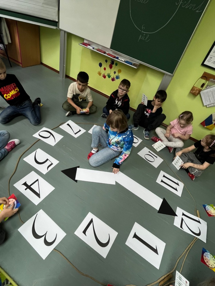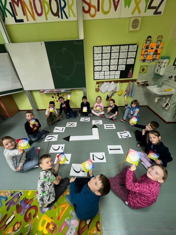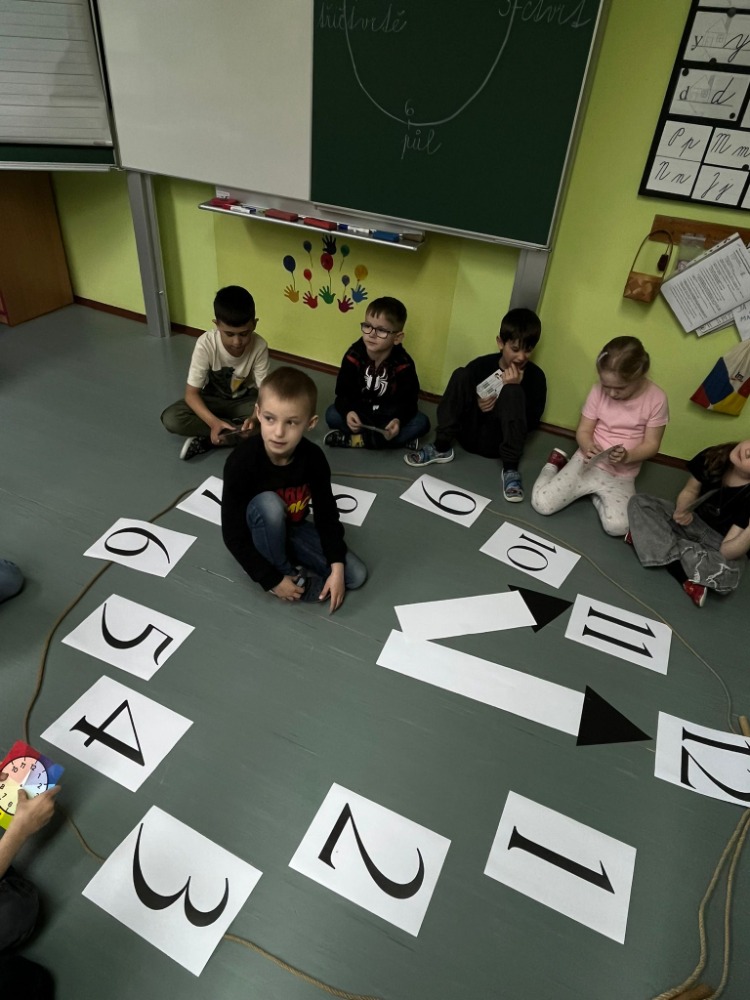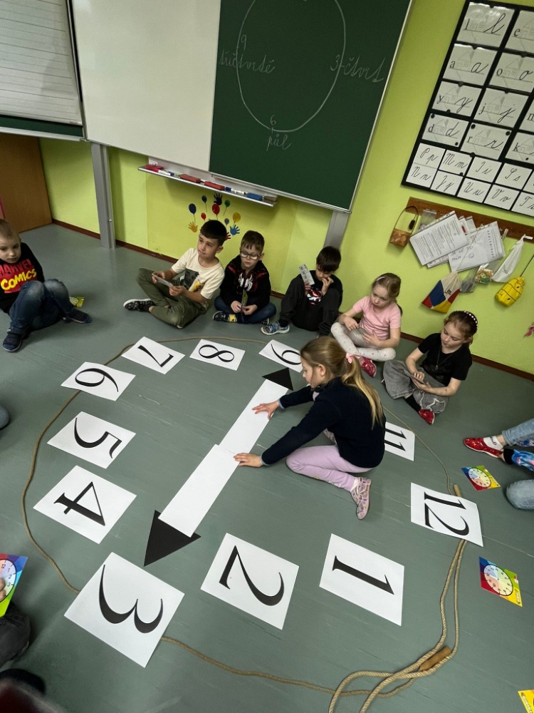 Na podlaze třídy jsme měli připravené velké papírové hodiny, které se staly centrem našeho učení. Děti si samy zkoušely posouvat ručičky podle zadaného času a postupně si upevňovaly představu o celých hodinách. Velký úspěch měla aktivita na chodbě naší školy – přiřazování digitálního času k analogovým hodinám, kdy žáci hledali správné dvojice a vzájemně si pomáhali.