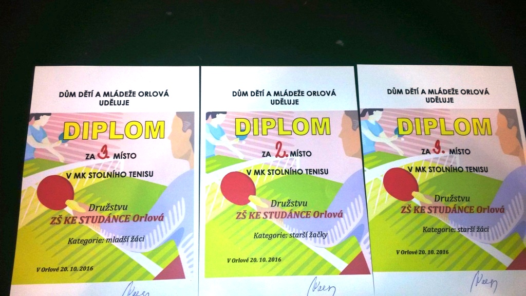 20.10.2016Ve čtvrtek 20.10. 2016 se jedenáct našich žáků zúčastnilo městského kola ve stolním tenise. V kategorii mladších žáků nás reprezentovali Kováč Kristián, Rylko Martin, Zelníček Matěj a Taraba Daniel. V kategorii starších žákyň to byly Regecová Veronika, Weglarzová Kristýna a Gabzdylová Anna a za starší žáky hráli Truhlář Filip, Klčo Petr a Červeňák Jiří. Oba týmy chlapců skončily ve své kategorii na třetím místě, děvčata se umístila o jeden stupínek lépe.