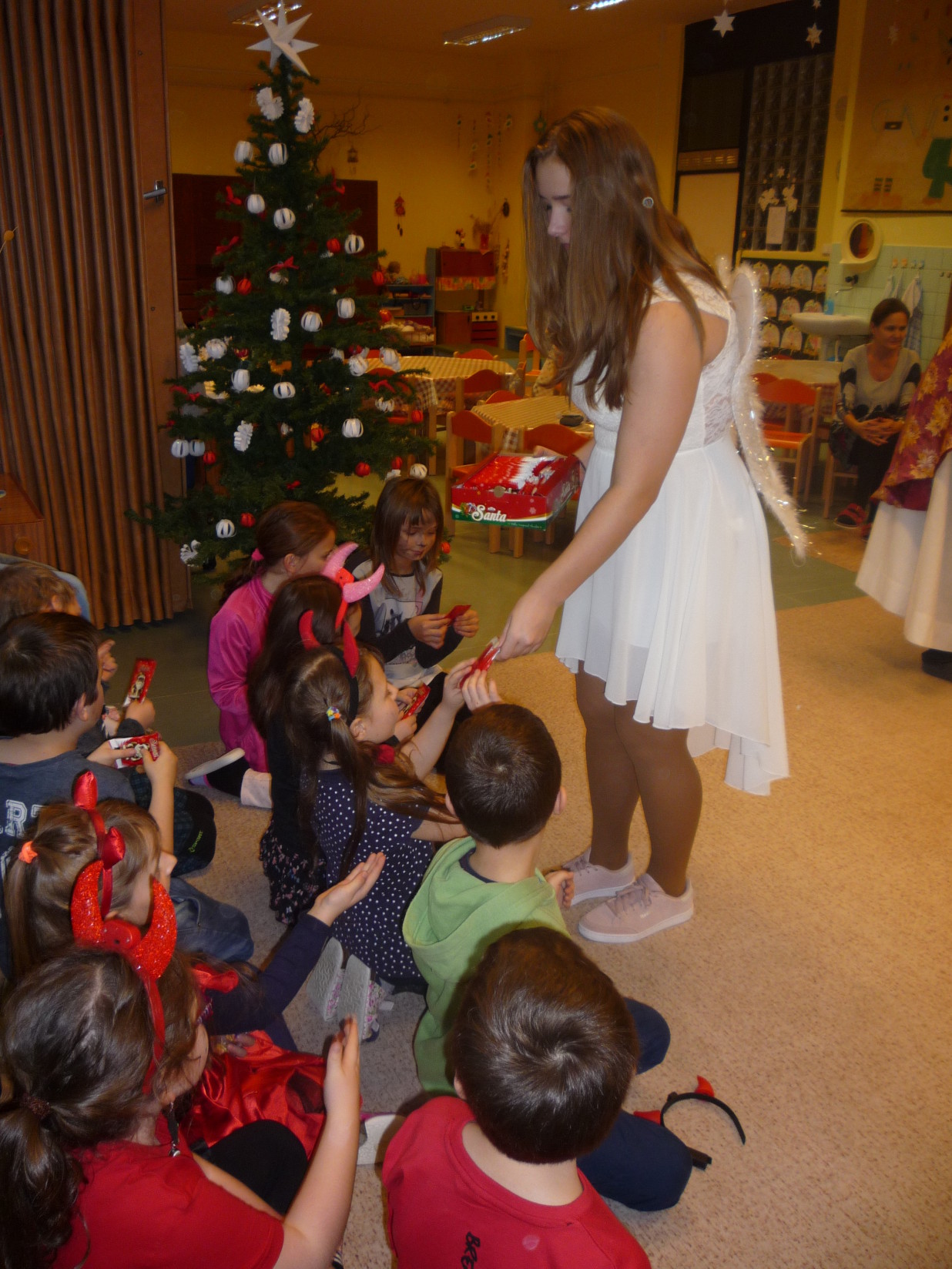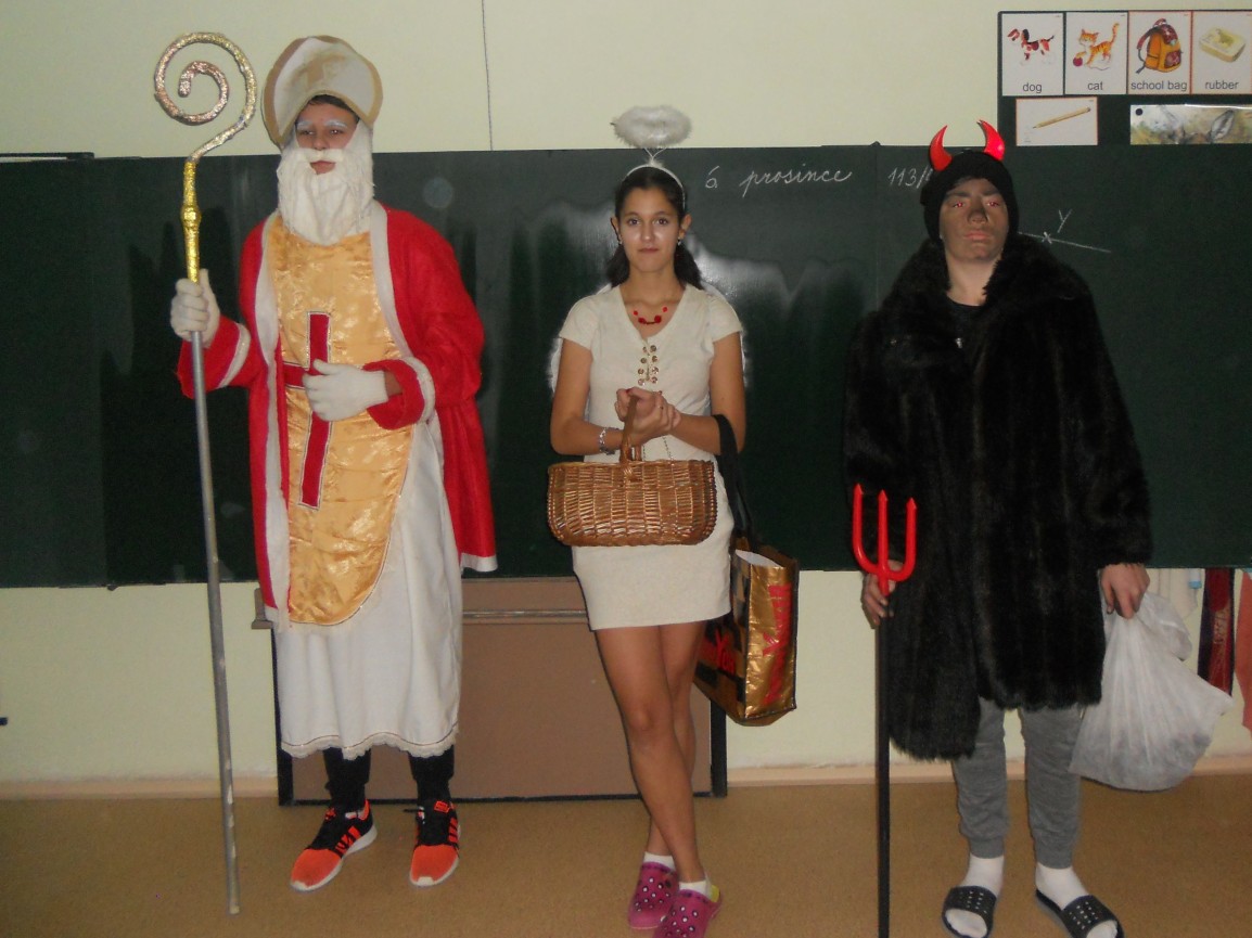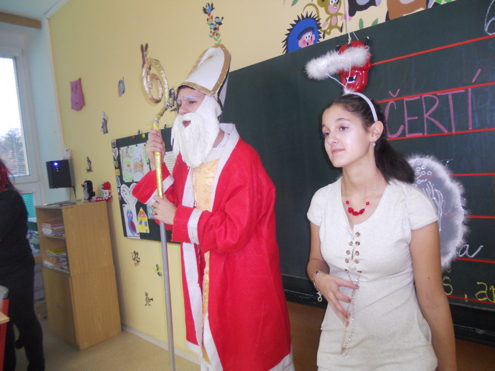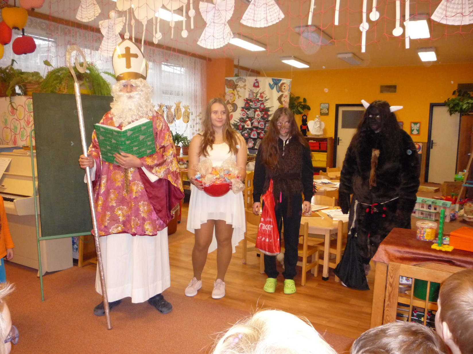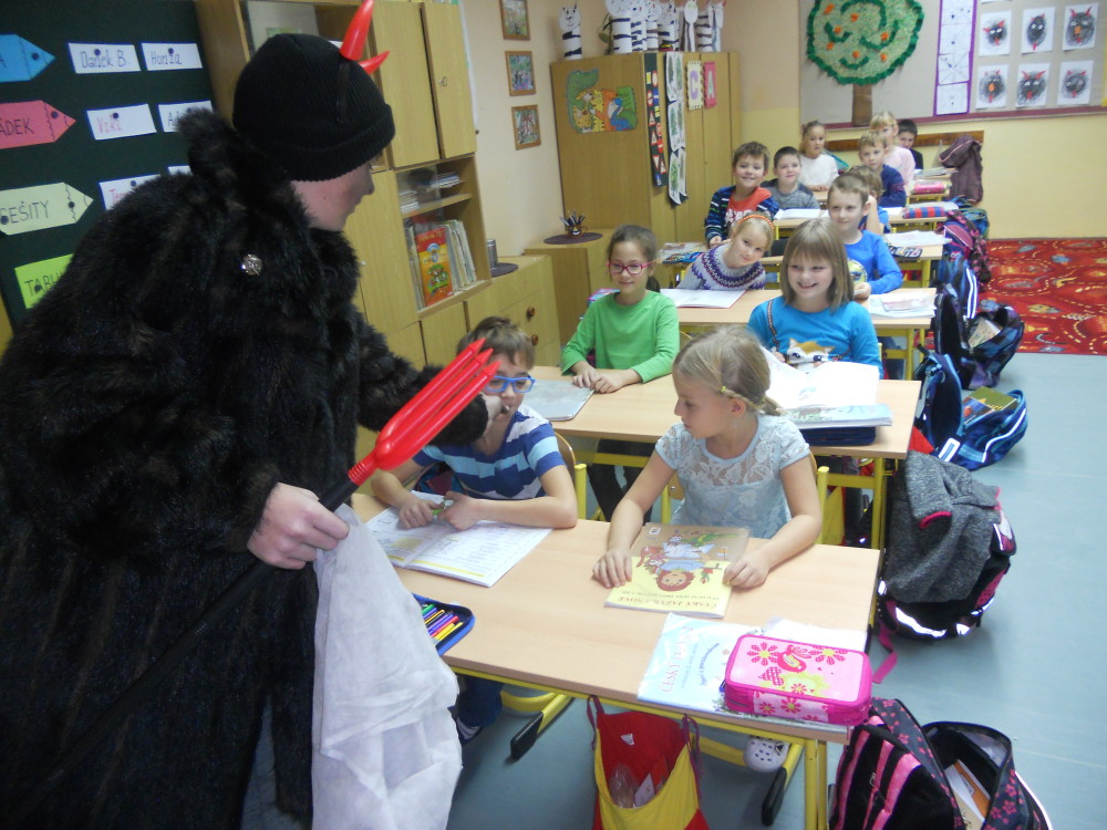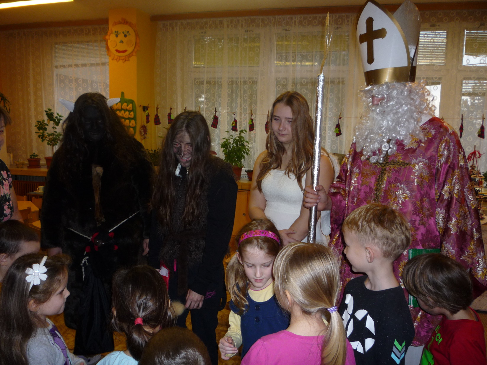 7.12.2017Ve středu navštívil Mikuláš se svými pomocníky mateřskou školu Ke Studánce a také žáky prvního stupně naší školy. Děti své hříchy vykoupily písničkami a za odměnu dostaly od Andílků něco na zub. Čertíci si označili zlobidla uhlím a Mikuláš připomněl, že na všechny bude celý rok dohlížet pozorným okem. Takže zase za rok, Mikuláši!