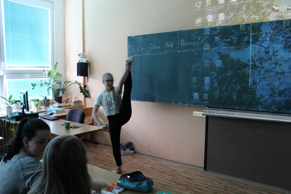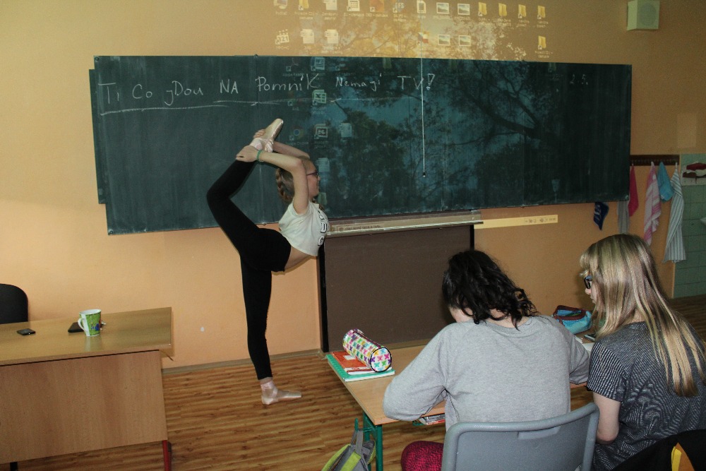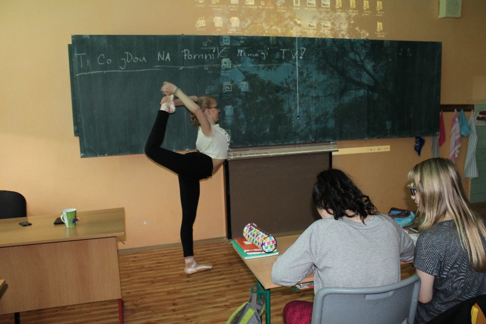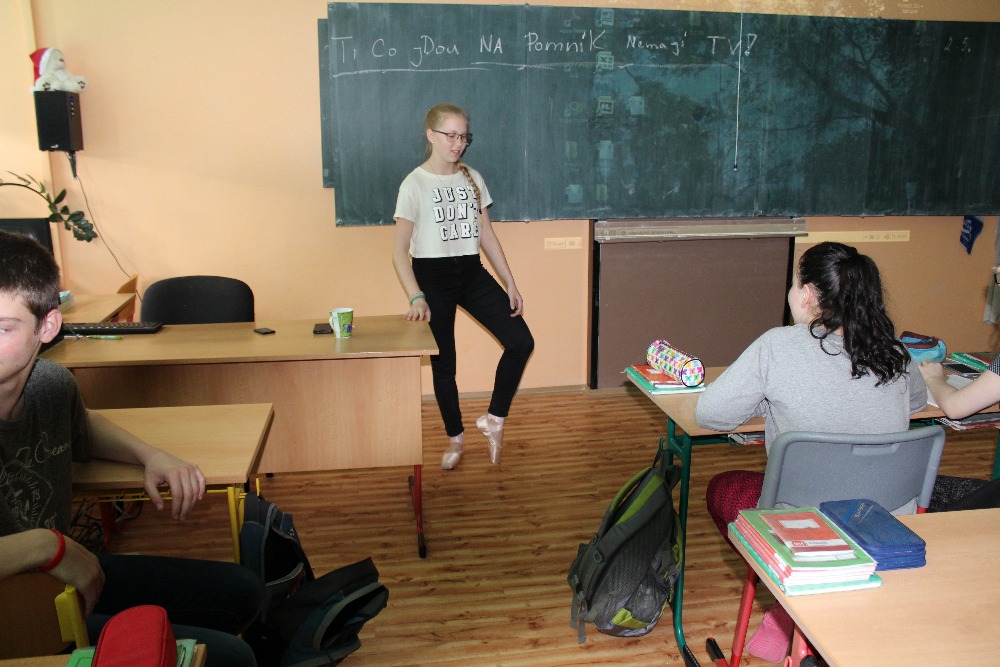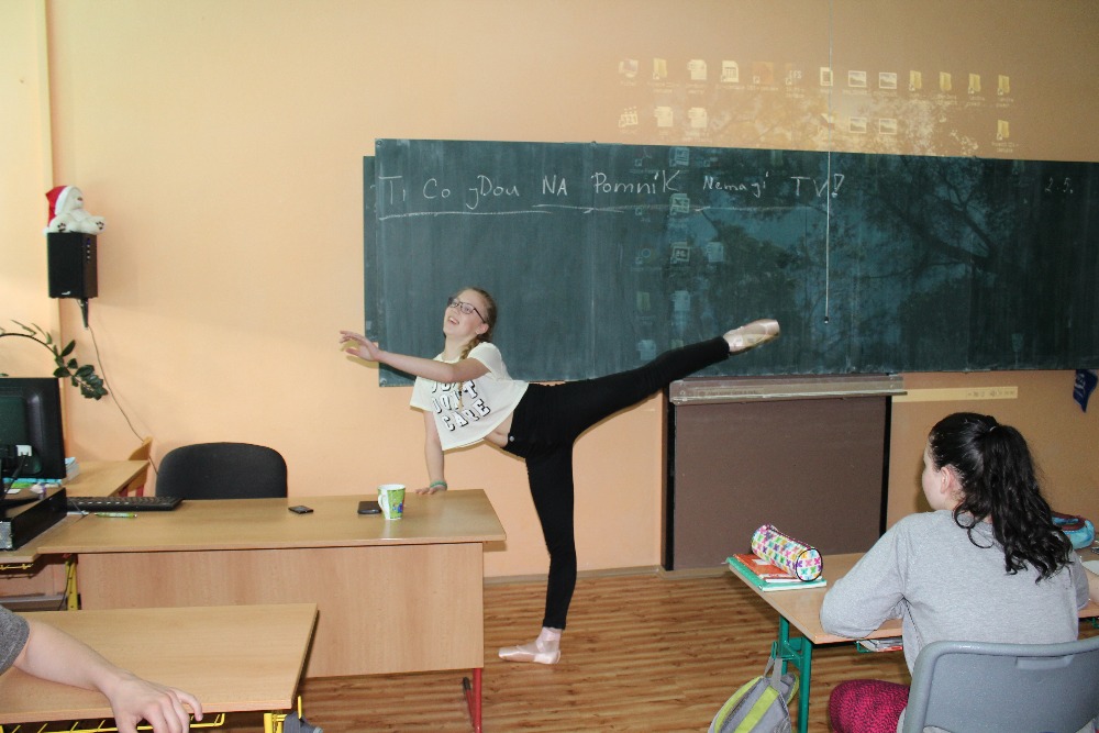 4.5.2016Dne 3.5. nás navštívila bývalá spolužačka Bája Krejčová, která navštěvuje Janáčkovu konzervatoř v Ostravě. S baletem začla v 6.třídě, kdy také od nás odešla a začala se aktivně věnovat klasickému baletu. Na videu nám ukázala lednové vystoupení, kde se svými spolužáky tančila klasický balet, modernu, ale i lidové tance. Předvedla nám osobně, jak se tančí se ,,špičkami“ např: pirouete, echappé, retire, pas de bouré suisse.