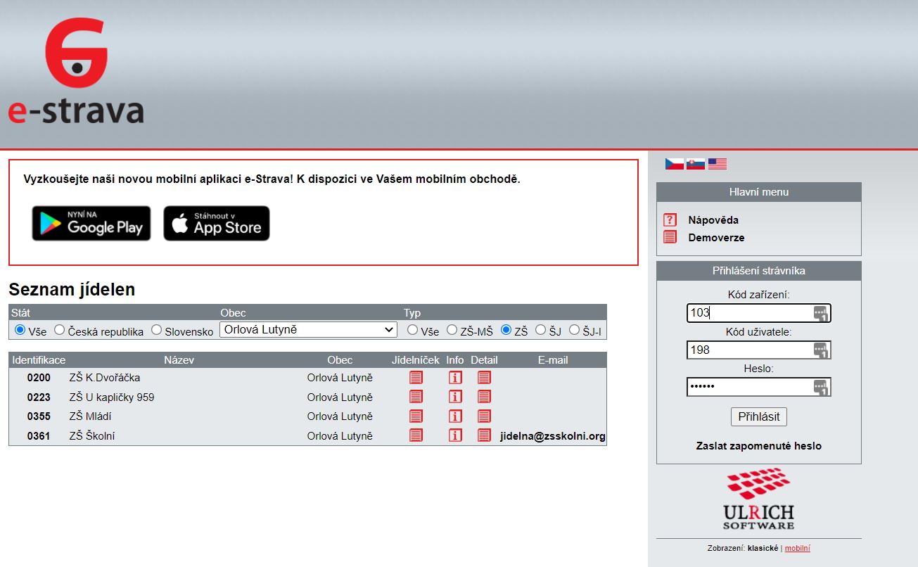 Máme tady další digitální pokrok 😊. Náš školní stravovací systém e-Strava Ulrich, který používáme, udělal krok vpřed a zprovoznil novou mobilní aplikaci e-Strava v Google Play a App Store. Jediné, co musíte udělat, je stáhnout si „apku“ a vyplnit přihlašovací údaje, které běžně používáte. Novinkou je přidání mailu. Doporučujeme u starších žáků přidat školní mail, který mají. Poté si budete moci nově spravovat i hesla.😉