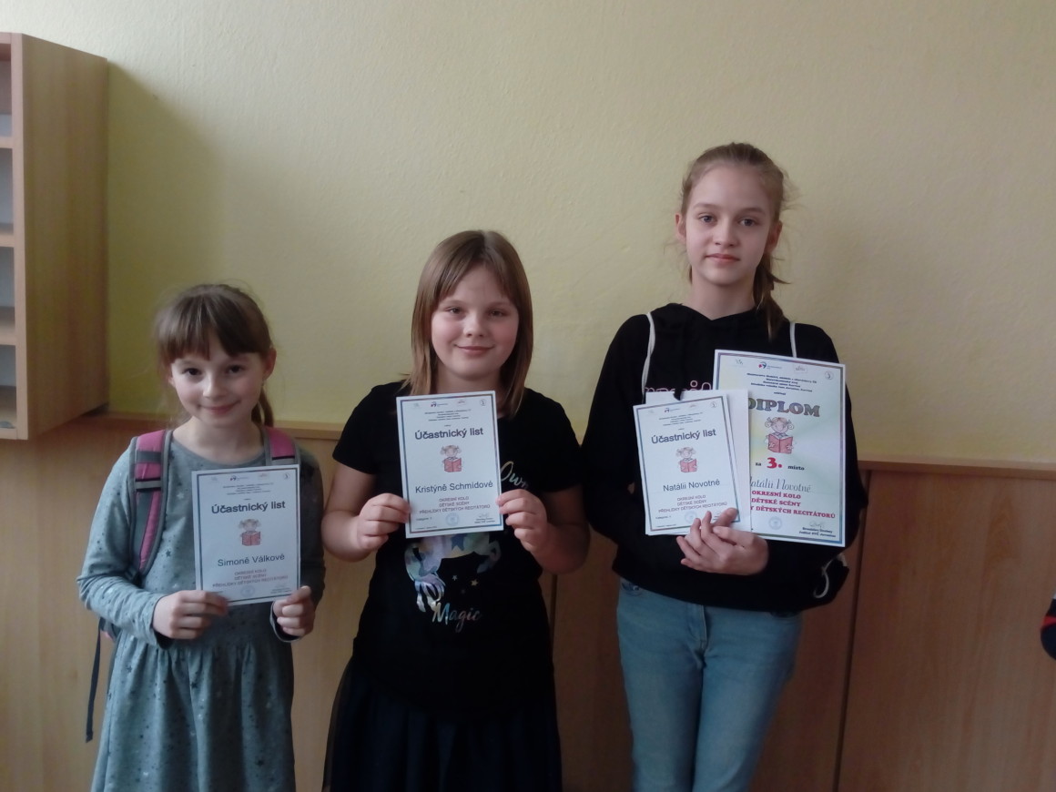 9.3.2020V pátek 6. února 2020 proběhlo okresní kolo Dětské scény – přehlídka dětských recitátorů v Karviné. Recitační soutěž byla rozdělena podle věku dětí na I. až IV. kategorii. Naši školu reprezentovaly v I. až III. kategorii žákyně: Simona Válková (3. A), Kristýna Schmidová (4. A), Natálie Novotná (5. B), Eliška Tomicová (7. A). Všechny žáčky byly vzorně připraveny, za což patří velké poděkování pro paní učitelky – Mgr. A. Zamiškové, Mgr. V. Kramné, Mgr. A. Szczepanské a Mgr. V. Przywarové. Ve velké konkurenci recitátorů z okolních měst se na 3. místě umístila Natálie Novotná z 5. B. Natálce gratulujeme a všem děvčatům děkujeme za výbornou reprezentaci naší školy.