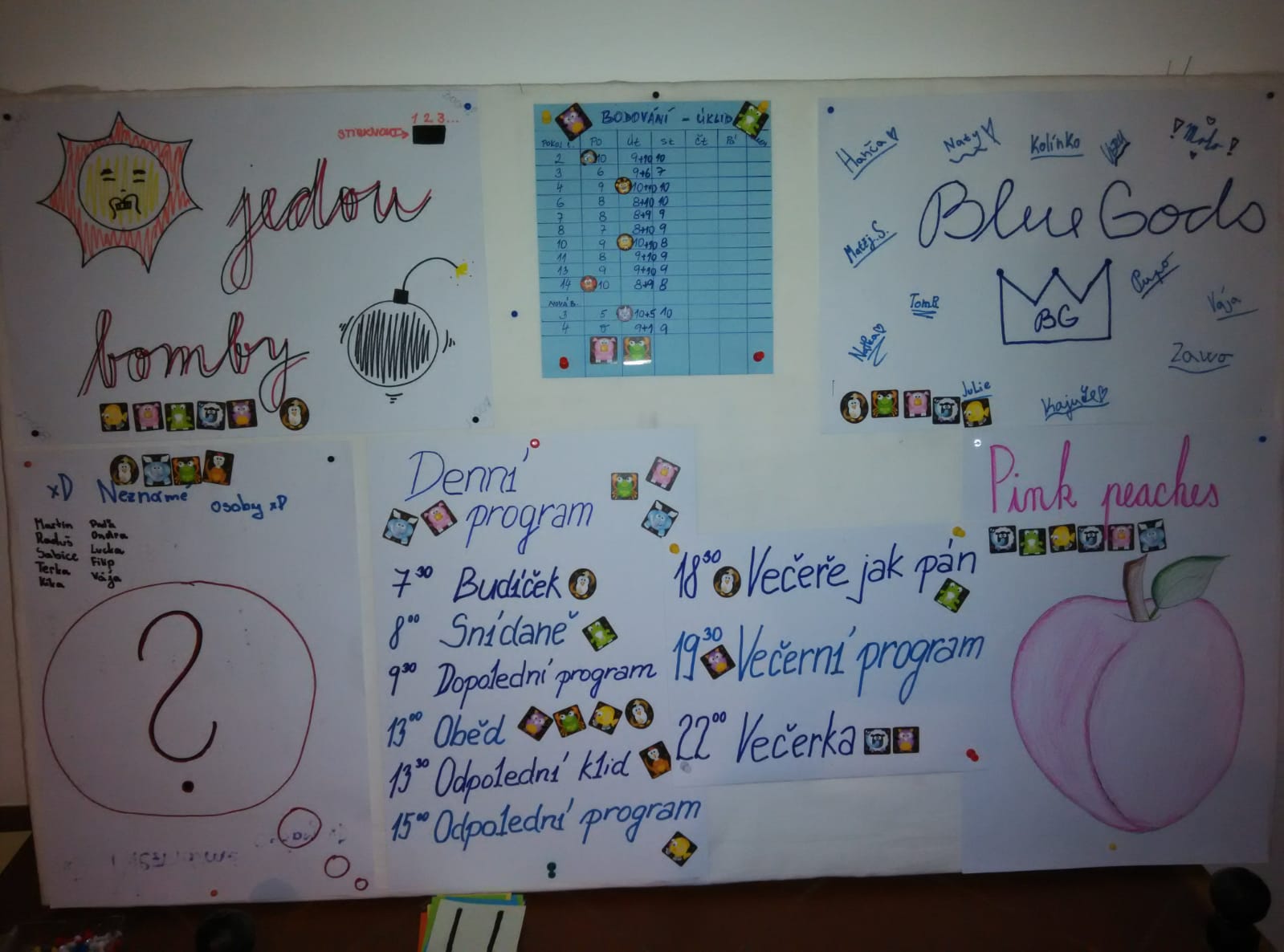 Večerní program většinou probíhal formou vědomostních soutěží, diskoték a karaoke. V úterý jsme se vydali na krátkou procházku okolím, kde mezi sebou týmy soutěžily v bojových soutěžích. Odpoledne pak proběhl turnaj ve vybíjené. Středeční den jsme strávili především uvnitř chaty, kdy mezi sebou týmy soutěžily ve vědomostních soutěžích. Ve čtvrtek se počasí mírně zlepšilo, proto jsme den využili sportovněji a utkali se ve fotbalovém turnaji. Odpoledne pak bylo věnováno opékání párků (kvůli nepřízni počasí, v troubě). Poslední večer si děti opět užily diskotéku a karaoke. Na závěr nemohla chybět ani stezka odvahy. V pátek nám konečně vysvitlo slunce, tudíž jsme, kromě balení, věnovali volné chvíle sportovním aktivitám.