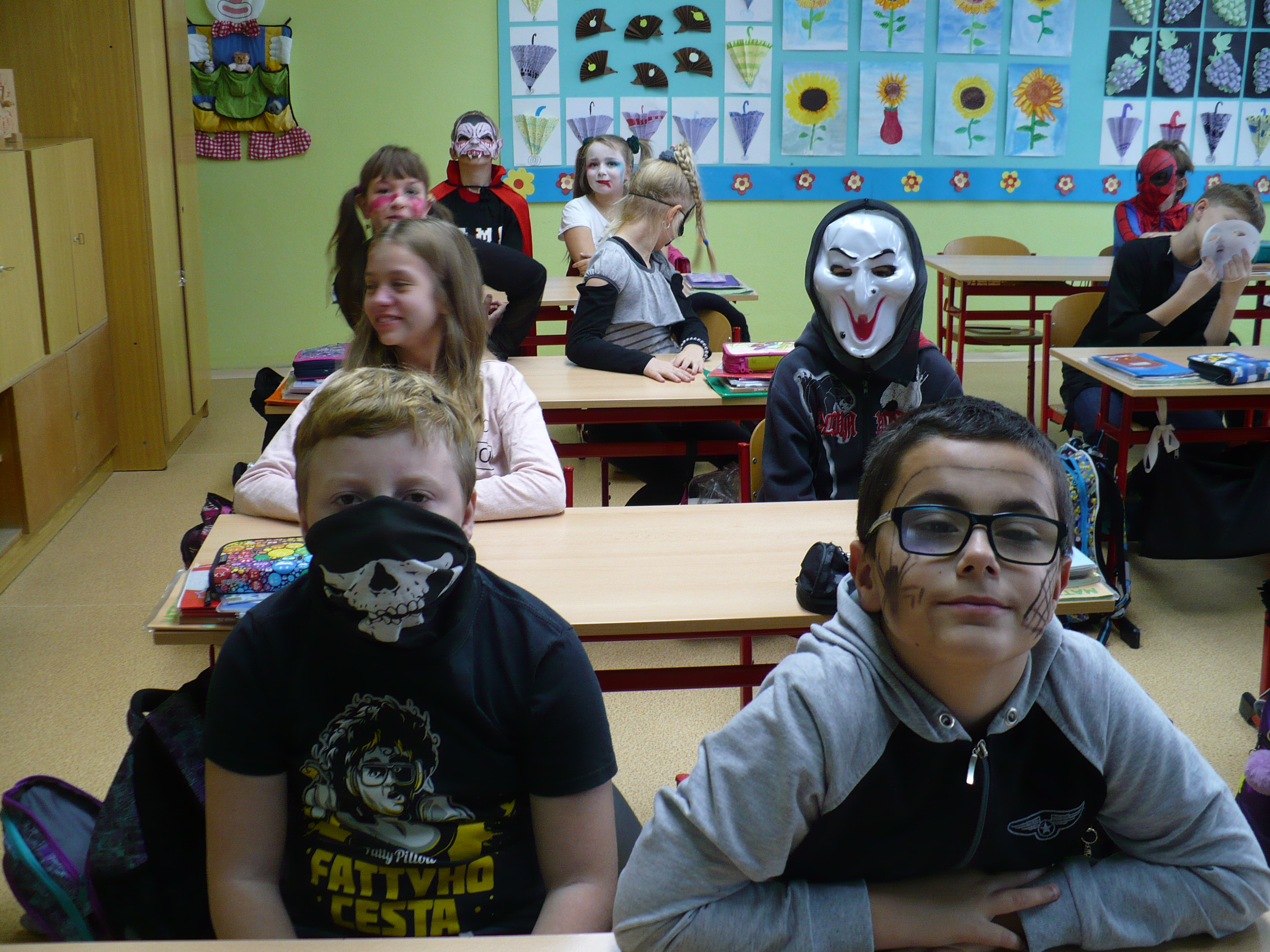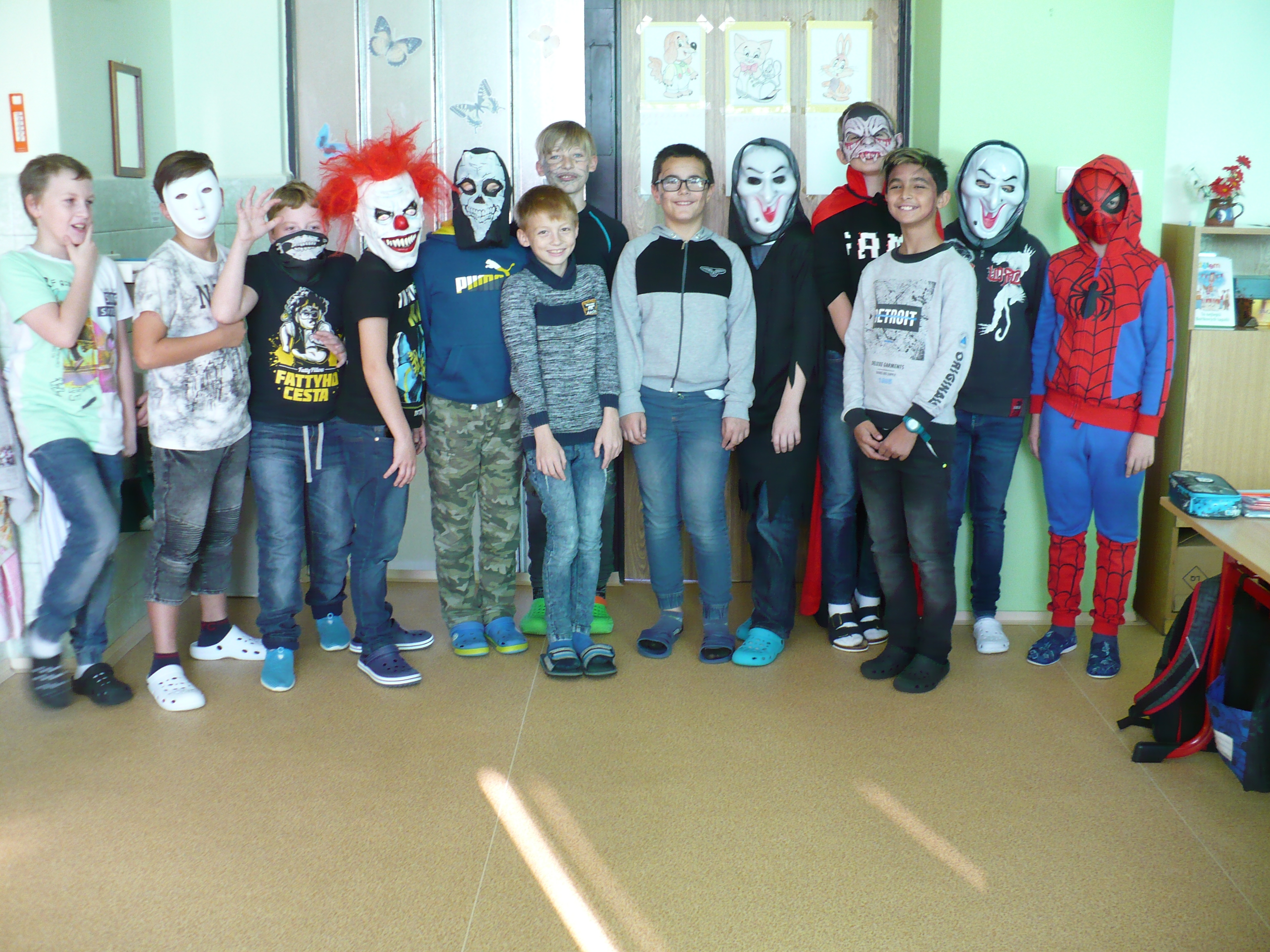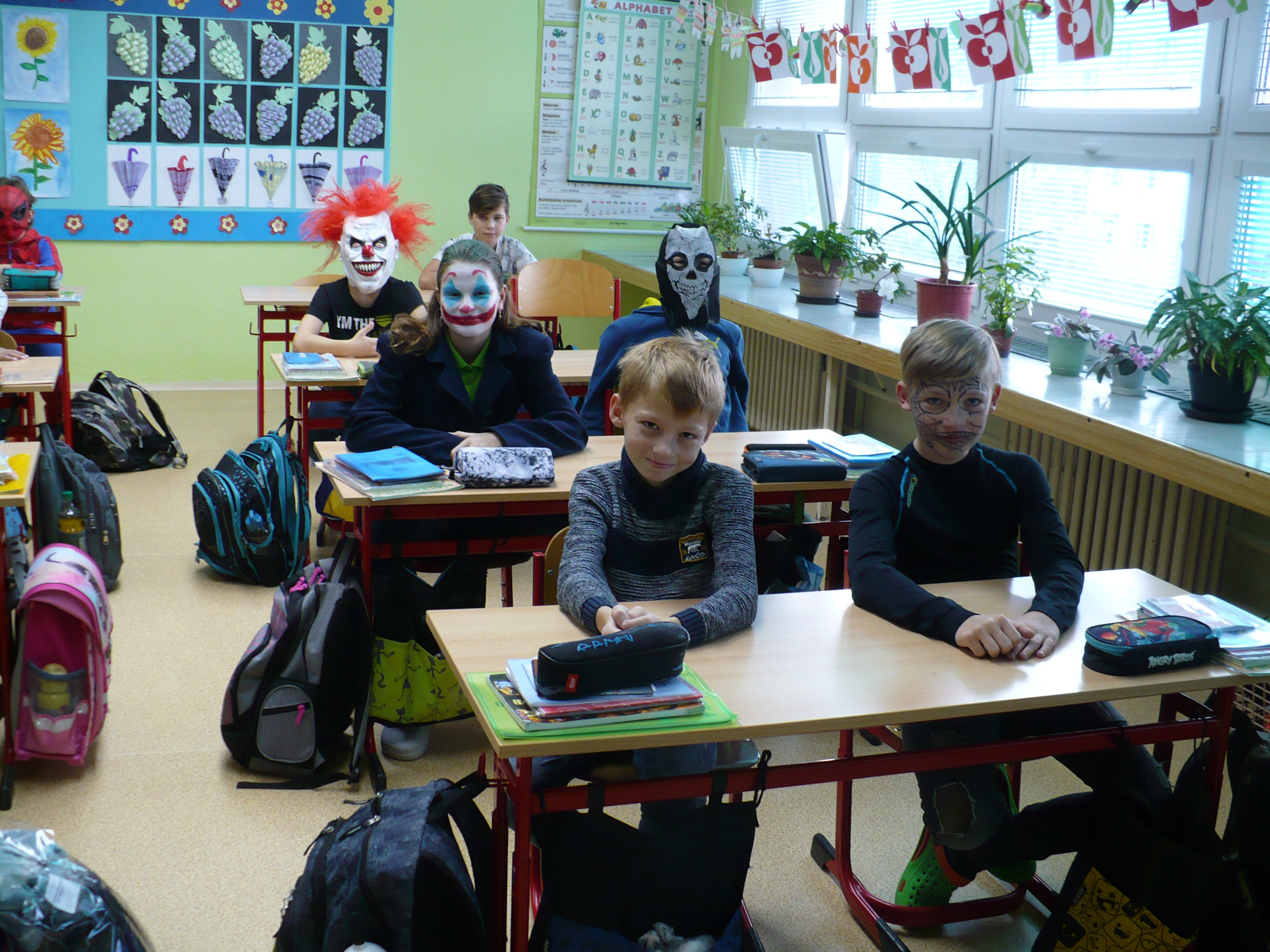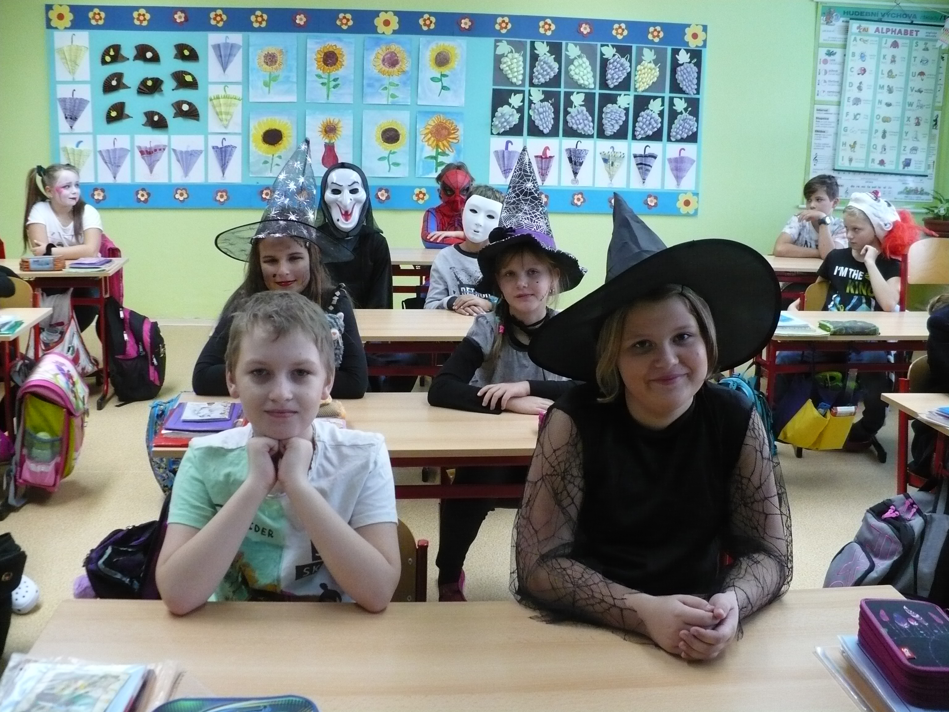 Z paní učitelky se stala čarodějnice a děti se nastrojily do libovolných strašidelných masek. V matematice jsme řešili úlohy o čarodějnicích a netopýrech a přitom jsme si procvičili jednotky času a logiku. V českém jazyce jsme řešili doplňovací cvičení plné čarodějných vět. V anglickém jazyce jsme si povídali o Helloweenu a vymýšleli jsme jednoduché věty s číslovkami. Ve čtení jsme si připomněli také naše podzimní svátky – dušičky. Za správná řešení ve všech hodinách byly děti sušenkami, bonbony nebo podzimními samolepkami.