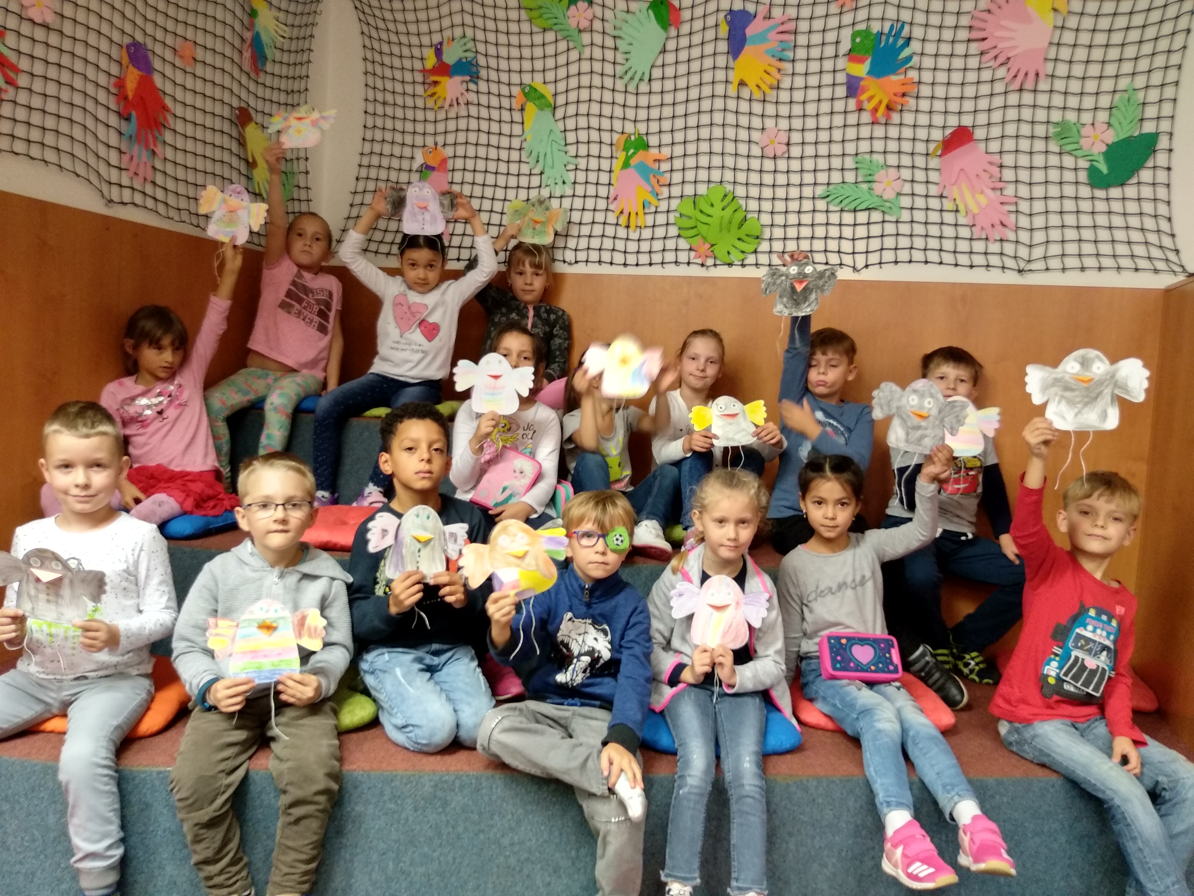 Po tomto výkladu dětem přečetla poučný příběh o vrabčáku Kamilovi, který neuměl létat. Děti během četby předvídaly děj a také nakonec správně vyslovily ponaučení, které z příběhu plyne. Velkou radost měli všichni z připravených šablonek vrabčáka Kamila, kterého si pak vybarvili a vyzdobili.