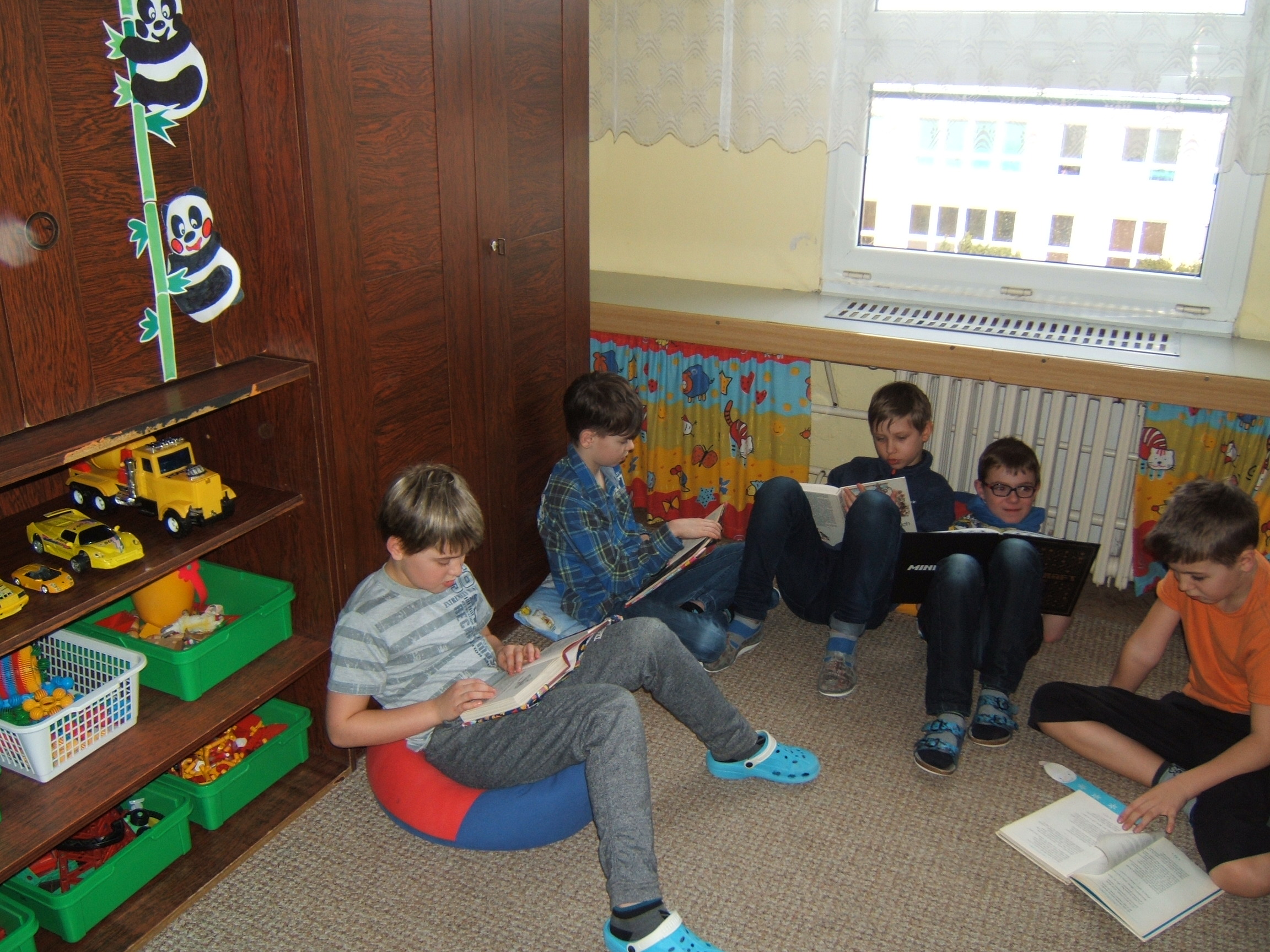 Děti čtou své vybrané knihy v hodinách čtení, o přestávkách a někteří si je berou i na čtení domů. Místem pro četbu není jen třída, ale také herna ŠD, kterou máme naproti naší třídy. Tam si každý najde své místo pro čtení, které zpříjemňuje z domova přinesený polštářek.