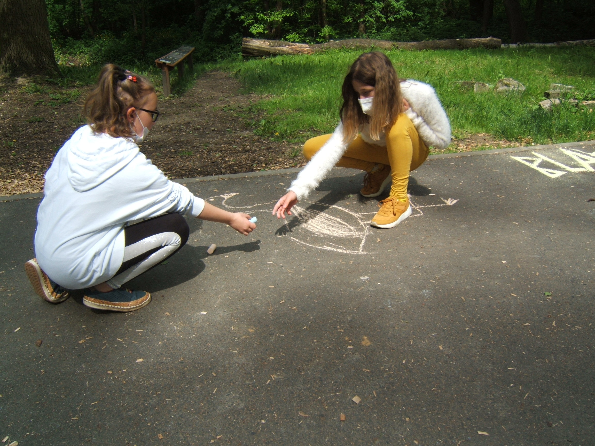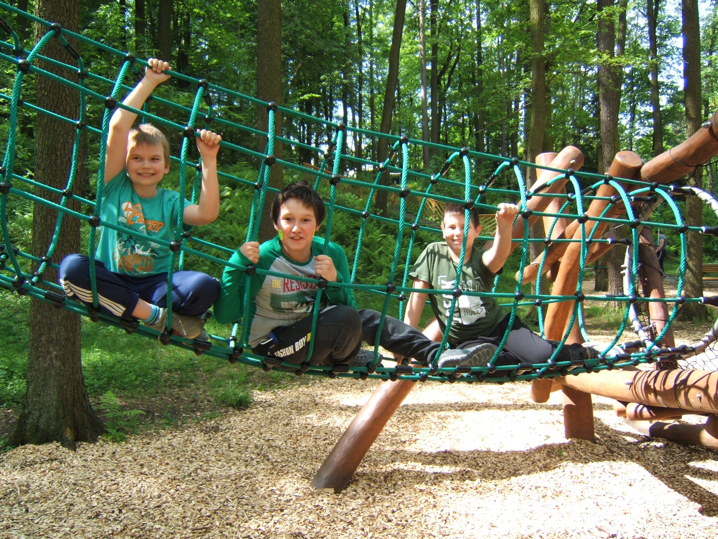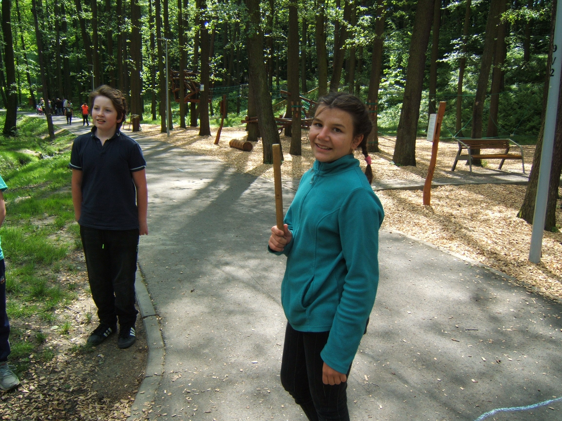 Po deváté hodině jsme pak vyrazili směrem k lesoparku, kde si děti také kromě běhu zadováděly na nejrůznějších prolézačkách, houpačkách a jiných atrakcích, ti klidnější kreslili křídou na chodník. Po vyčerpávajícím dovádění jsme se šli občerstvit zmrzlinou a ledovou tříští.