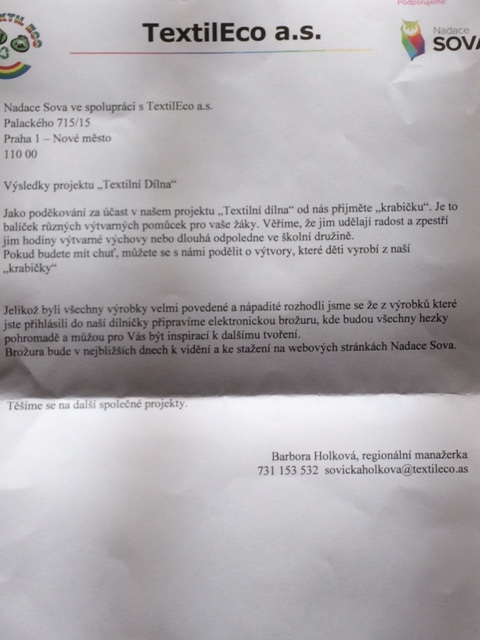 5.4.2018V tomto školním roce se třída 2.B zúčastnila celostátní soutěže „Textilní dílna“ – Nadace Sova ve spolupráci s TextilEco a.s.