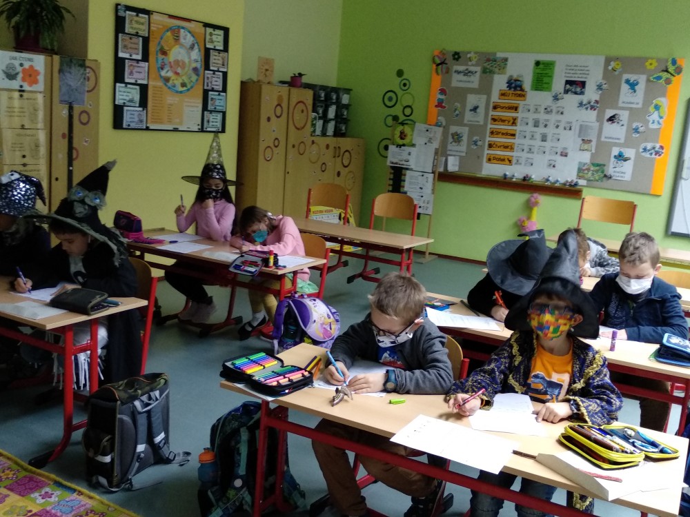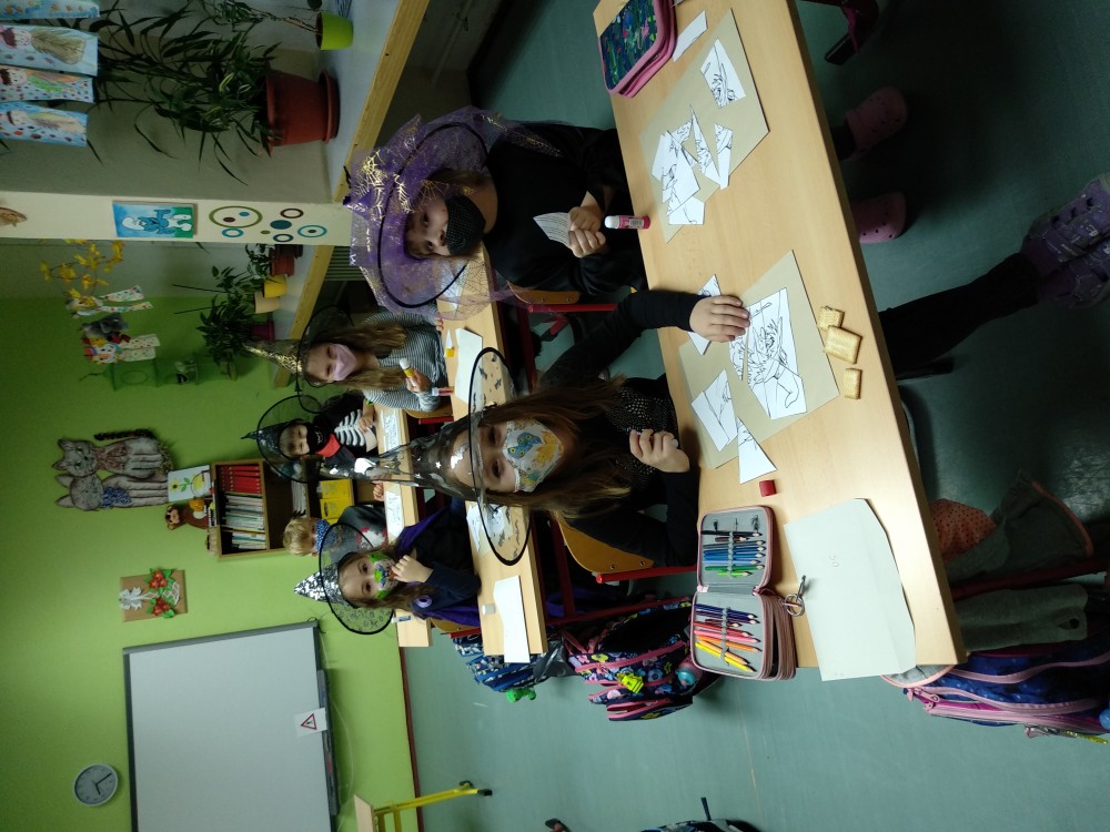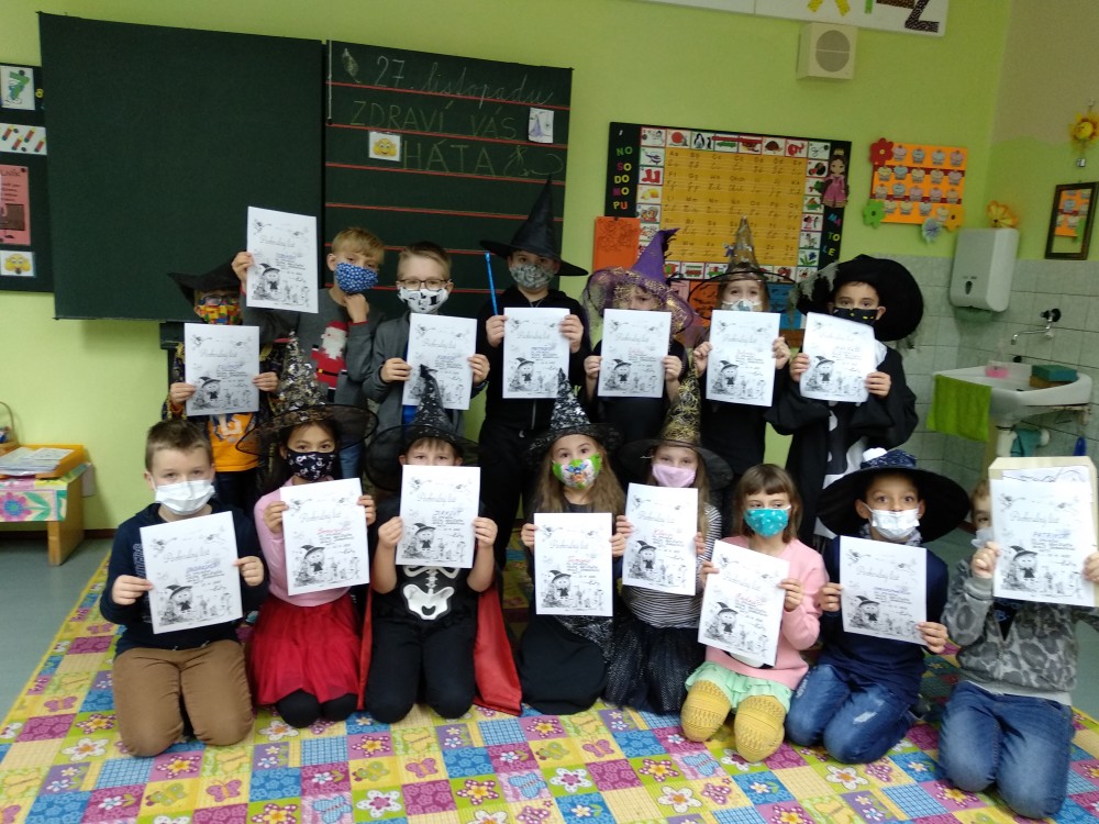 Zopakovali jsme si v nich abecedu, řazení slov podle abecedy, skládání slov do vět, anglické pojmenování barev, hledali jsme rozdíly mezi dvěma obrázky, ukázali Hátě správnou cestu bludištěm, počítali jsme její zvířecí kamarády a zkoušeli jsme si zapamatovat, co všechno má Háta v čarodějnické třídě. Prostě bylo toho až nad čarodějnickou hlavu, ale děti byly šikovné a splnily všechny úkoly přesně načas.