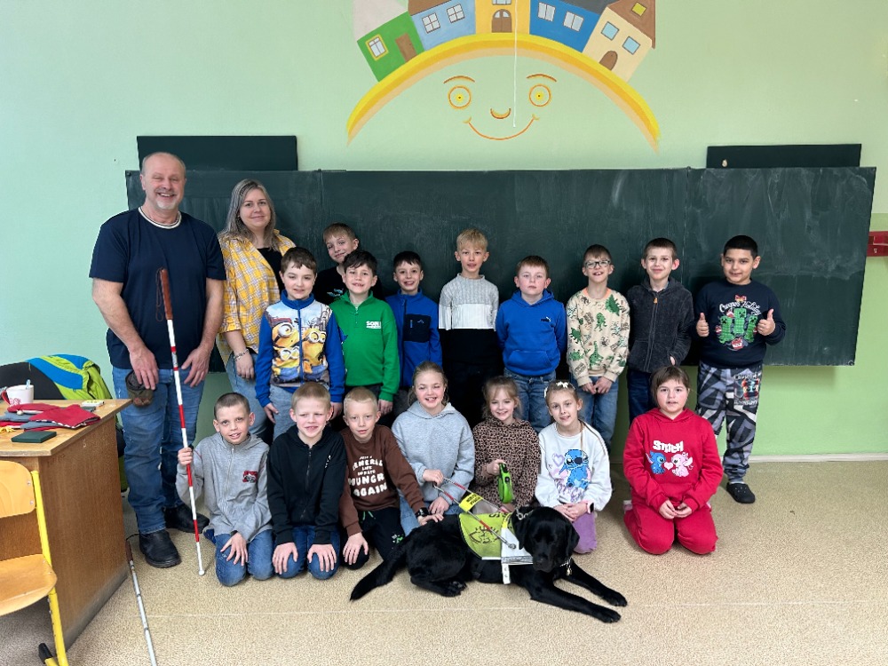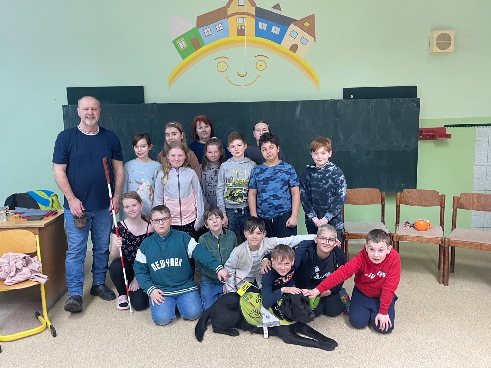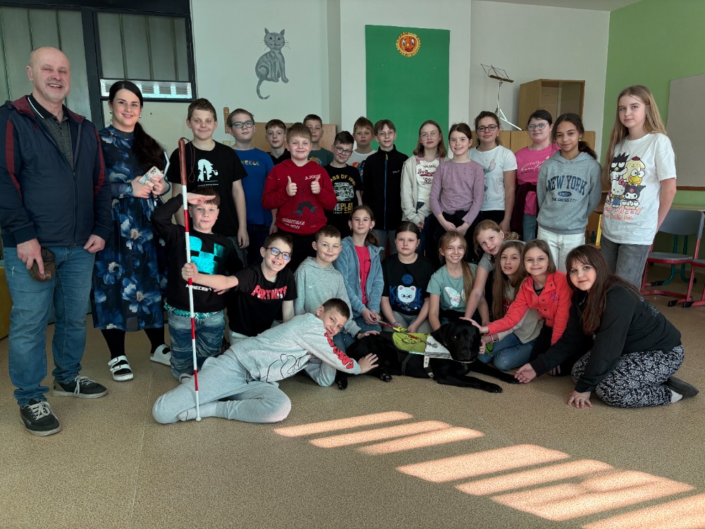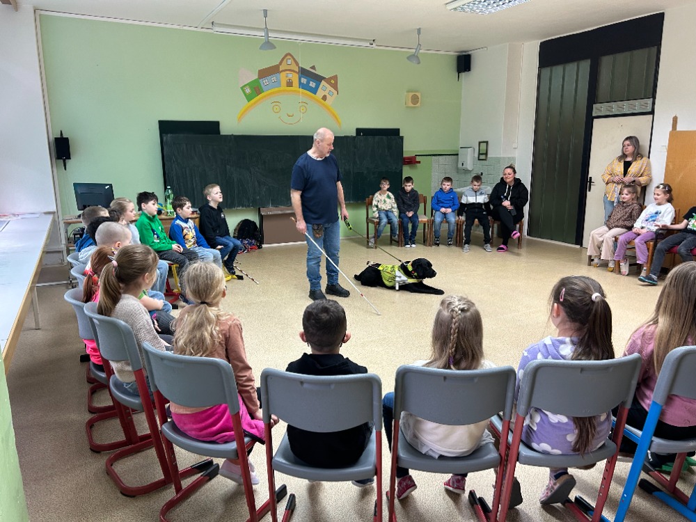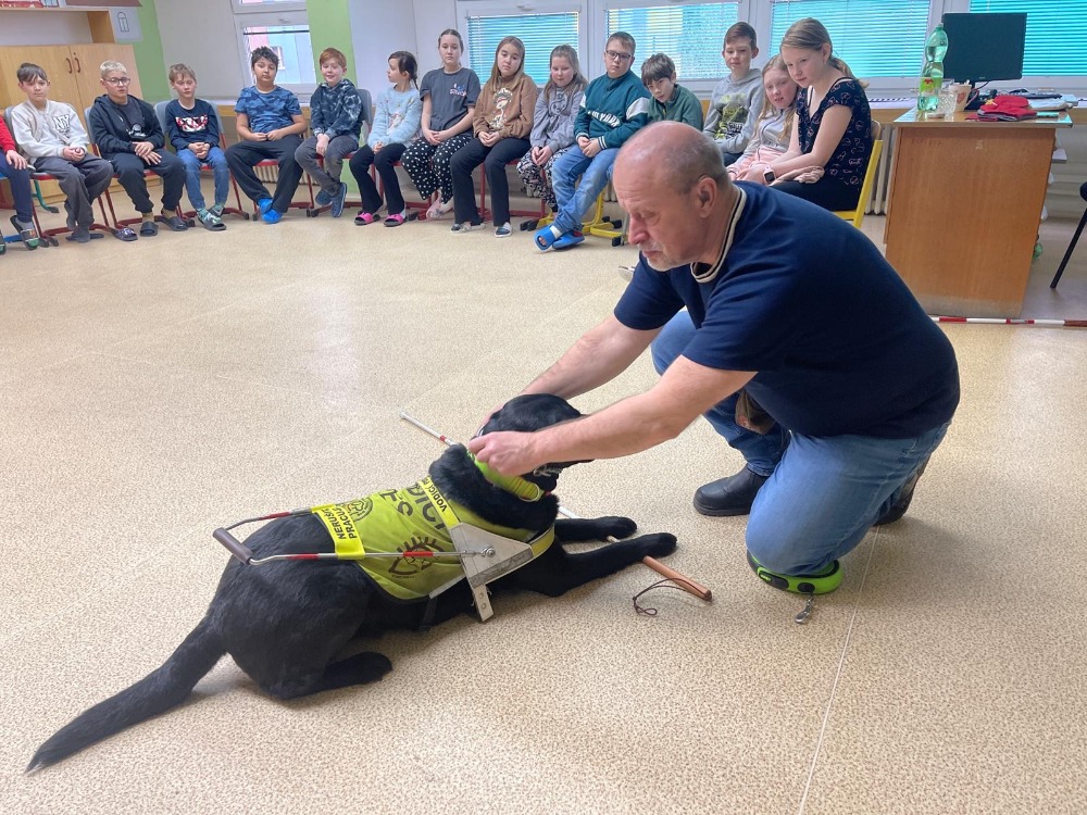 27.3.2026Na naší škole se uskutečnila velmi zajímavá a poučná přednáška o vodicích psech, která byla určena pro všechny třídy prvního stupně. Přednášku vedl pan Holba, který nám poutavým způsobem přiblížil svět nevidomých lidí a jejich čtyřnohých pomocníků. Během setkání jsme se dozvěděli mnoho nového o výcviku vodicího psa. Pan Holba nám vysvětlil, jak dlouho trvá, než se pejsek naučí všechny potřebné dovednosti, a co všechno musí umět, aby mohl svému majiteli bezpečně pomáhat v běžném životě. Velmi zajímavé bylo také povídání o tom, jak důležitou roli hraje vzájemná důvěra mezi psem a jeho pánem. Součástí přednášky bylo i vysvětlení, k čemu slouží slepecká hůl a jak ji nevidomí lidé používají při orientaci. Dozvěděli jsme se také, jak správně oslovit nevidomého člověka a jak mu nabídnout pomoc tak, aby to pro něj bylo příjemné a přirozené. Pan Holba nám navíc ukázal různé pomůcky, které nevidomí lidé používají v každodenním životě. Největší zájem však vzbudil samotný vodicí pejsek, který předvedl, jak skvěle je vycvičený a jak poslušně reaguje na pokyny. Na závěr přednášky byl prostor pro dotazy, na které pan Holba ochotně odpověděl. Přednáška byla velmi zajímavá, poučná a všechny žáky velmi bavila. Odnesli jsme si z ní spoustu nových informací i větší pochopení pro život nevidomých lidí.