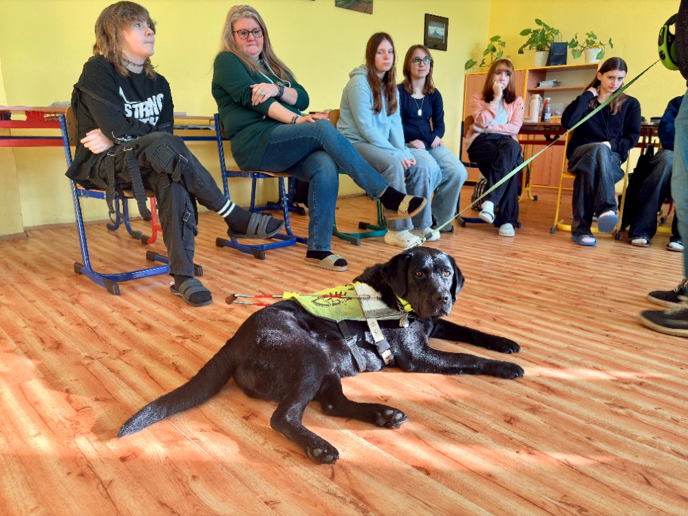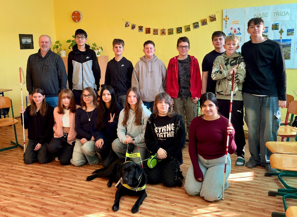 22.2.2026Naši sedmáci z 7.B zažili výjimečné setkání s nevidomým hostem a jeho vodicím psem Kellym. Pan Holba žákům poutavě vyprávěl svůj životní příběh a přiblížil jim, s jakými situacemi se lidé se zrakovým postižením každodenně setkávají. Kelly předvedl, co všechno vodicí pes dokáže a jak svému pánovi pomáhá v běžném životě.