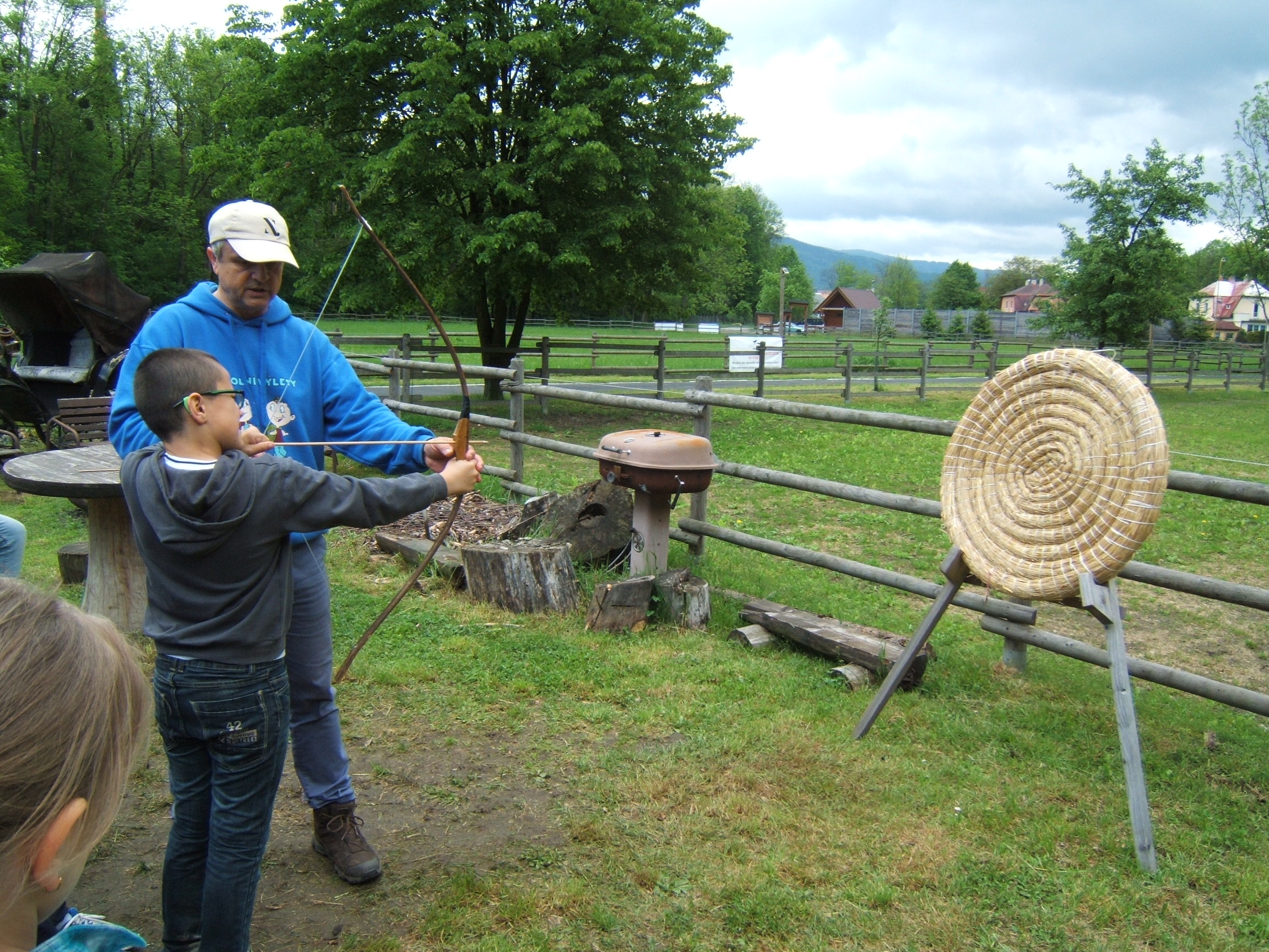 Po obědě byl pro děti připraven zábavný program: střelba z luku do terče, pokus o chůzi na chůdách, jízda na koních a venkovní trampolíny. Žáci byli rozděleni do družstev a soutěžili mezi sebou. Pak měli chvíli rozchod, aby si mohli koupit drobné suvenýry a sladkosti.