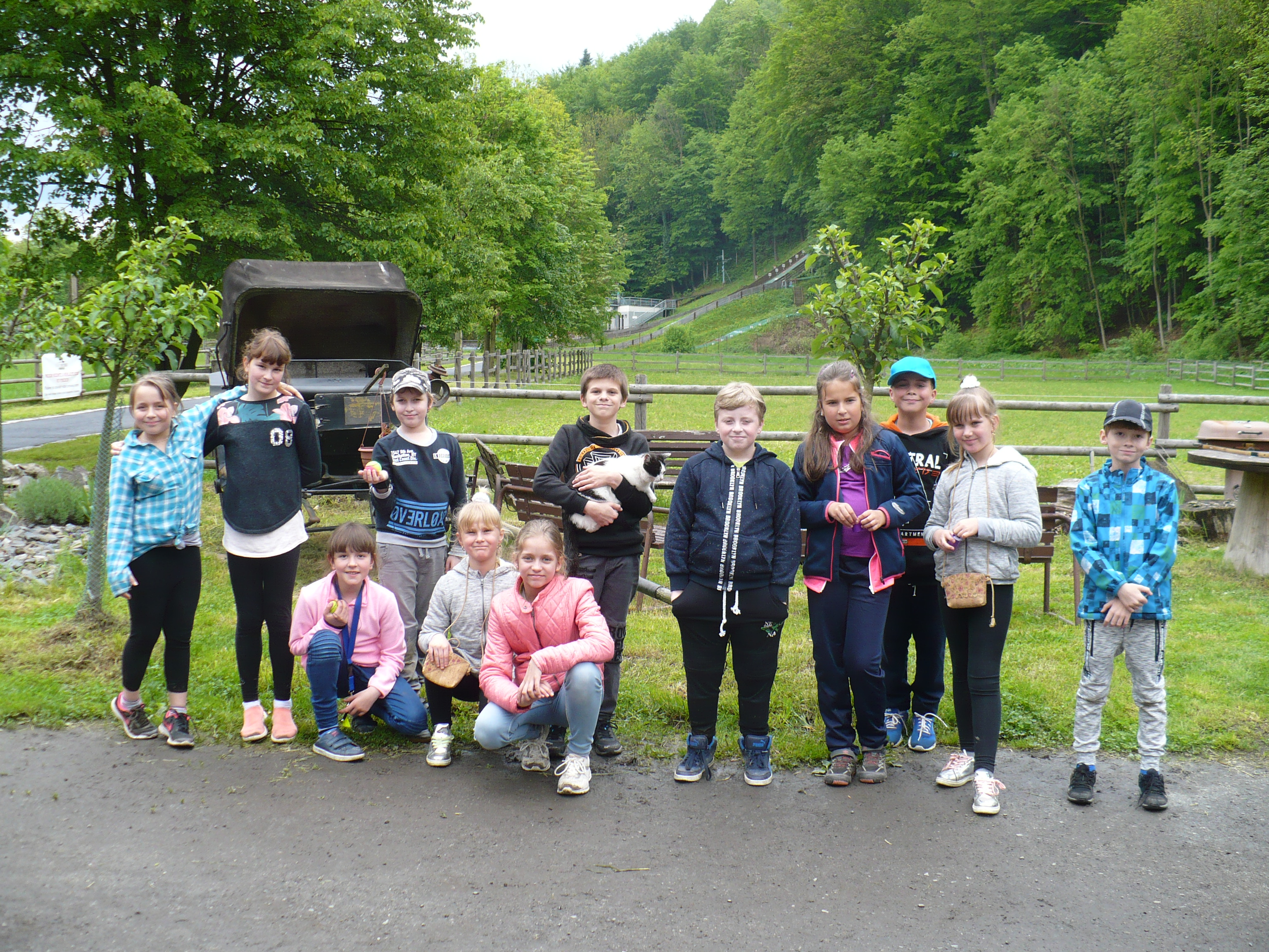 S paní průvodkyní jsme se vydali do vesničky ve skanzenu, prošli jsme malé chaloupky ze dřeva, přivítaly nás husy, kačer a nějaké kravičky. Nejvíce se dětem líbil veselý kozel, který na ně zvědavě vykukoval z okýnka svého chlívku. Nechal se hladit a vesele dětem olizoval ruce. Seznámili jsme se s životem našich předků. Prohlédli jsme si starý větrný mlýn a vydali se do kopce k Jurkovičově rozhledně. Po schodech většina vystoupala až na nejvyšší terasu, ze které byl krásný výhled do okolí. Zpátky jsme se vydali jinou cestou dolů. Bohužel paní průvodkyně si popletla turistické značky, a tak místo procházky lesem jsme kráčeli po ,,stezce odvahy“ s příkrým svahem . Navíc byla cesta po dešti plná bláta. Někomu se povedlo i upadnout, naštěstí se nikomu nic nestalo. Vzali jsme všechno s humorem.
