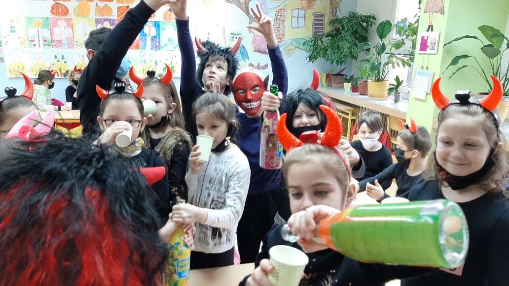 Vzduchem lítaly špunty, jak si ta čertovská cháska radostně připíjela. Mysleli si, že se budou jen válet, křepčit a cpát se sladkostmi, stejně jako u nich doma. Ke svému nemilému překvapení rychle zjistili, že to tak nejde. Ve škole se musí i pilně pracovat a hlavně poslouchat. To se jim moc nelíbilo a možná se v pondělí už nevrátí. Necháme se překvapit.
