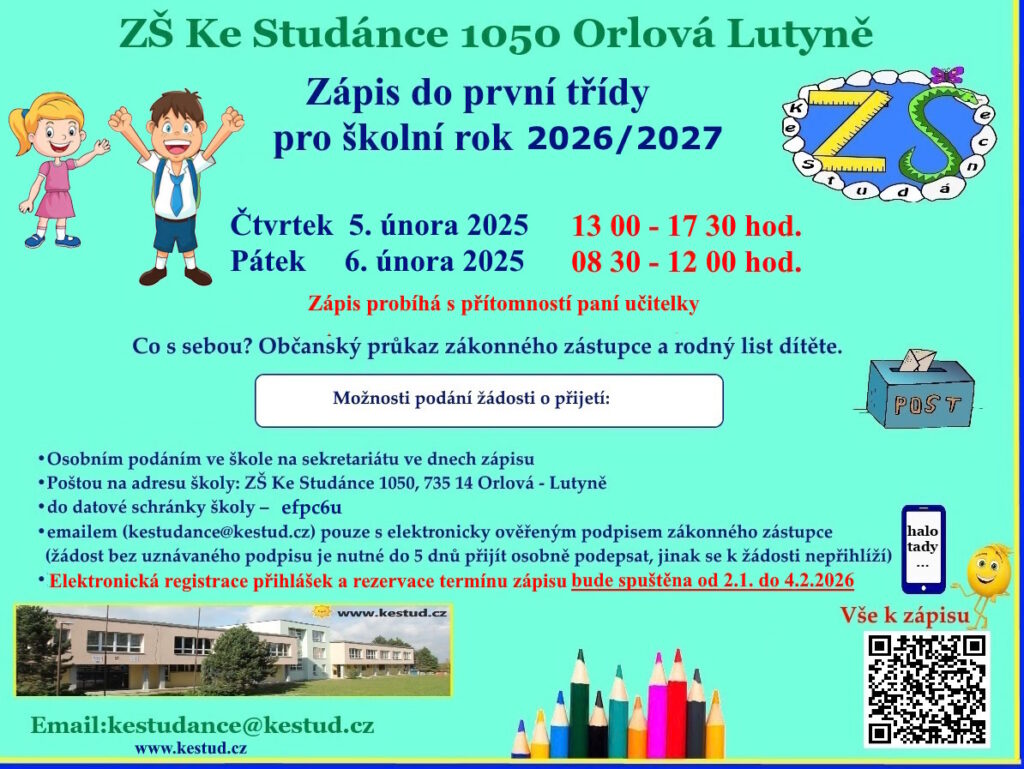 Seznamy přijatých/nepřijatých žáků 1. třídbudou zveřejněny pod registračními čísly na hlavním vchodu do budovy školy a na webových stránkách školy nejpozději dne 27.2.2026. Písemné Rozhodnutí o přijetí dítěte k základnímu vzdělávání si může zákonný zástupce dítěte vyzvednout na sekretariátu školy od 9. března 2026.